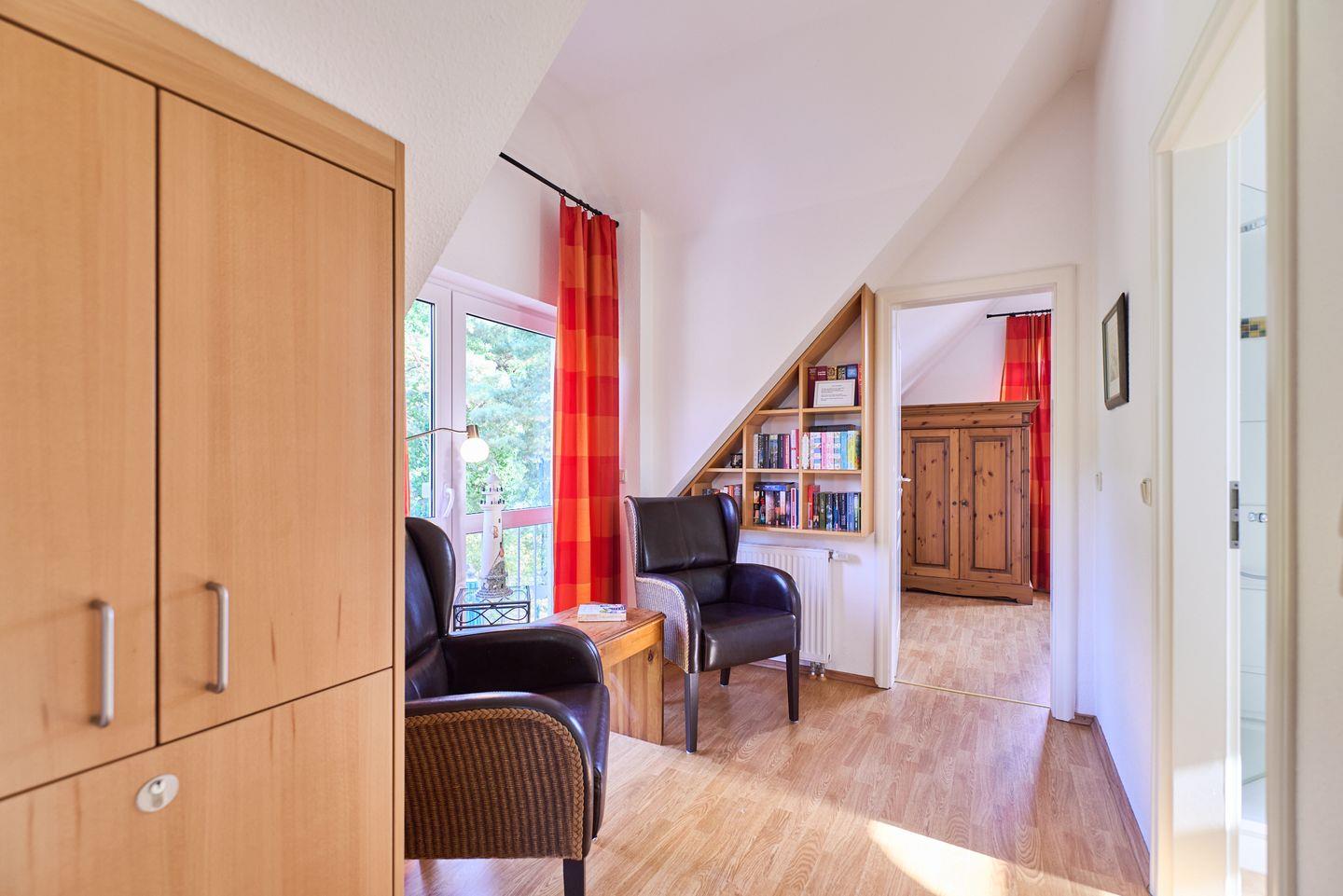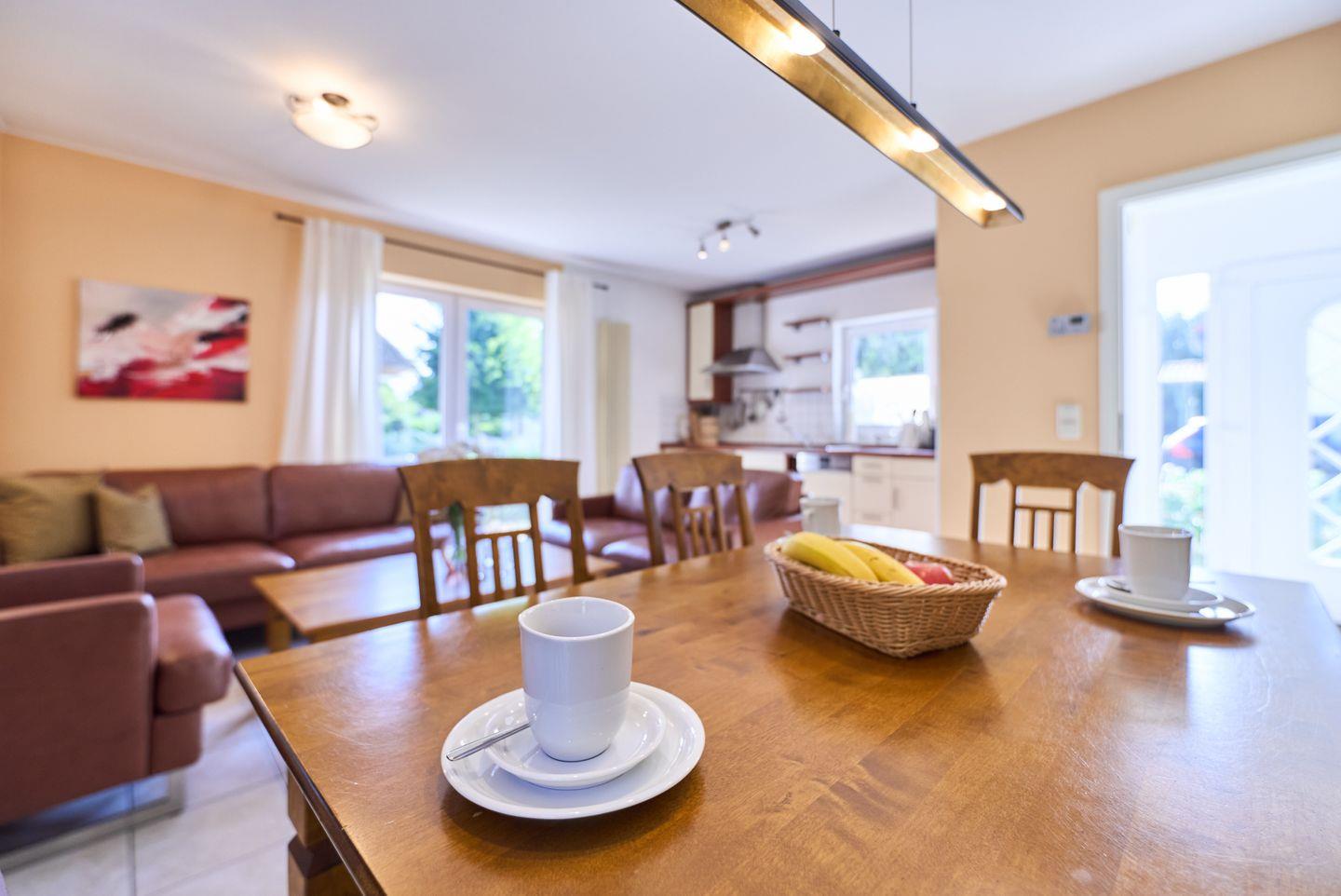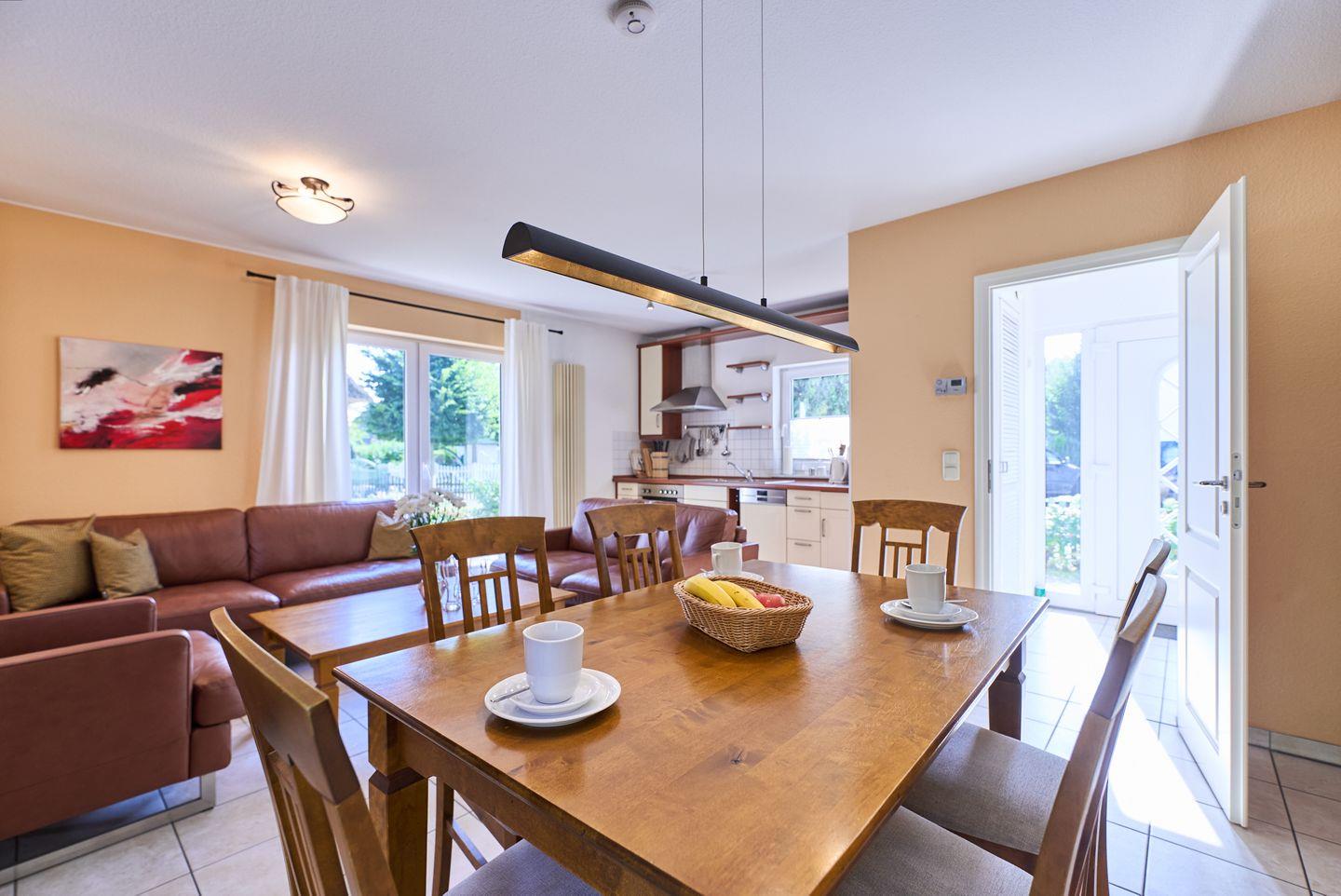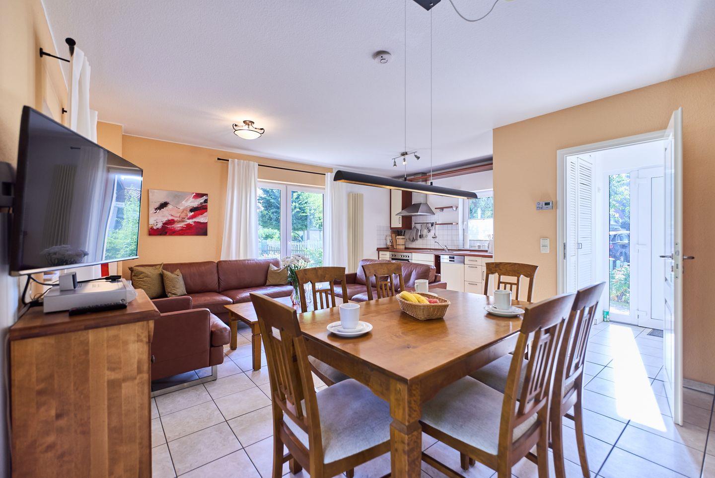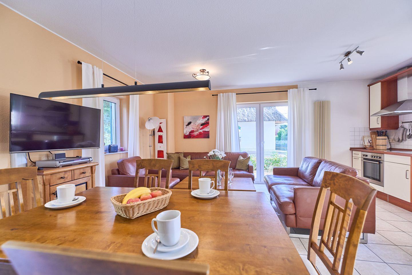 Der offene Wohnbereich mit hochwertigem Fliesenboden ist nicht nur ein Ort der Geselligkeit, sondern auch der zentrale Raum für entspannte Abende. Hier finden Sie ein bequemes Sofa, Sessel und einen Esstisch, der genug Platz für ein gemeinsames Essen oder Spieleabende mit Freunden oder der Familie bietet. Für Unterhaltung sorgt ein TV mit DVD- und CD-Player sowie eine kleine Bibliothek mit einer Auswahl an Büchern. Der WLAN-Zugang ermöglicht zudem bequemes Surfen und Streamen.