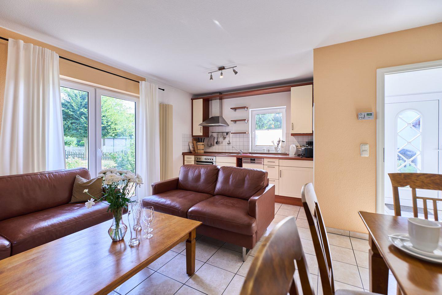 Die voll ausgestattete Küche bietet alles, was Sie für die Zubereitung köstlicher Mahlzeiten benötigen. Vom Cerankochfeld über den Backofen, Kühlschrank mit Gefrierfach bis hin zu praktischen Küchenutensilien wie Kaffeemaschine, Wasserkocher, Toaster und vieles mehr – hier bleiben keine Wünsche offen. Morgens können Sie Ihren Kaffee auf der sonnigen Terrasse genießen, die mit Gartenmöbeln ausgestattet ist und zu geselligen Grillabenden einlädt.