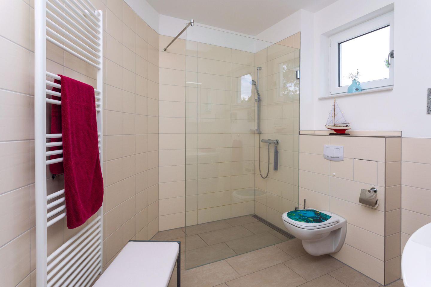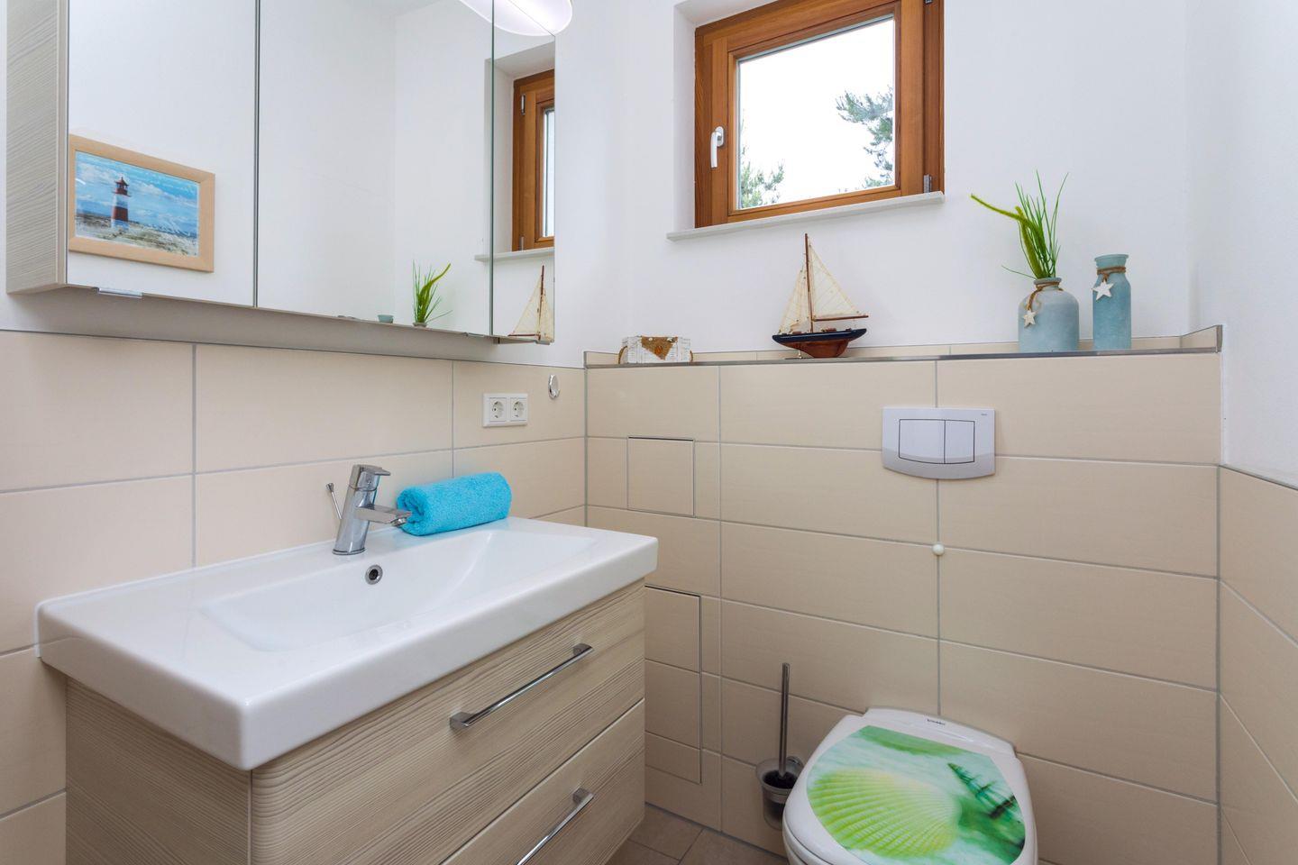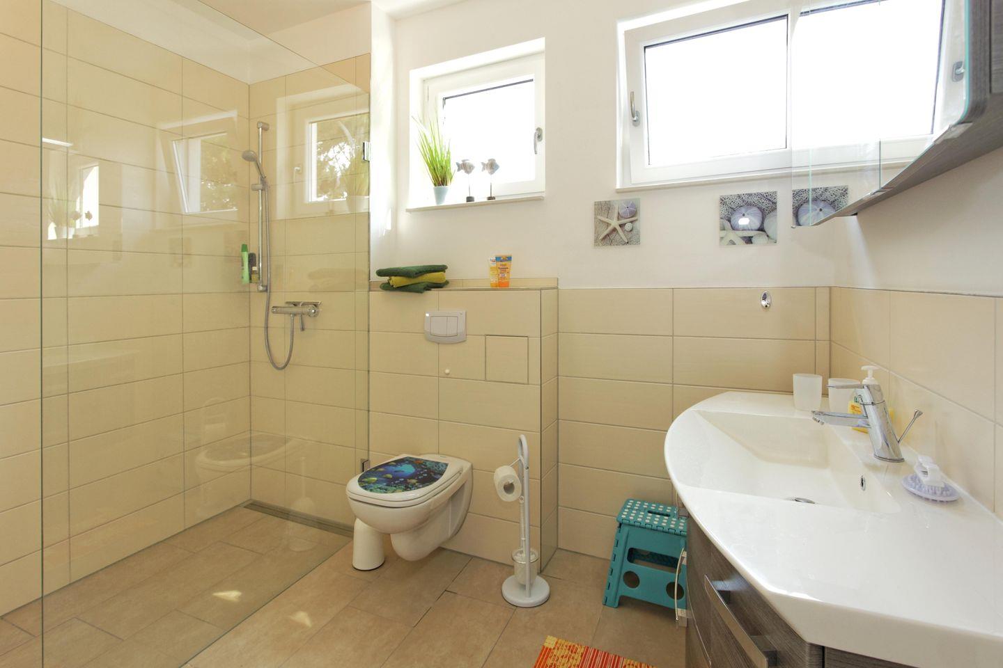 Das moderne Bad ist mit einer bodengleichen Dusche, einem Waschtisch mit Spiegel, Fenster, WC und warmem Wasser ausgestattet und garantiert Komfort und Funktionalität. Ein separates Gäste-WC erhöht den Wohnkomfort gerade bei Belegung durch mehrere Personen. Für längere Aufenthalte sorgt die vorhandene Waschmaschine für zusätzliche Bequemlichkeit.