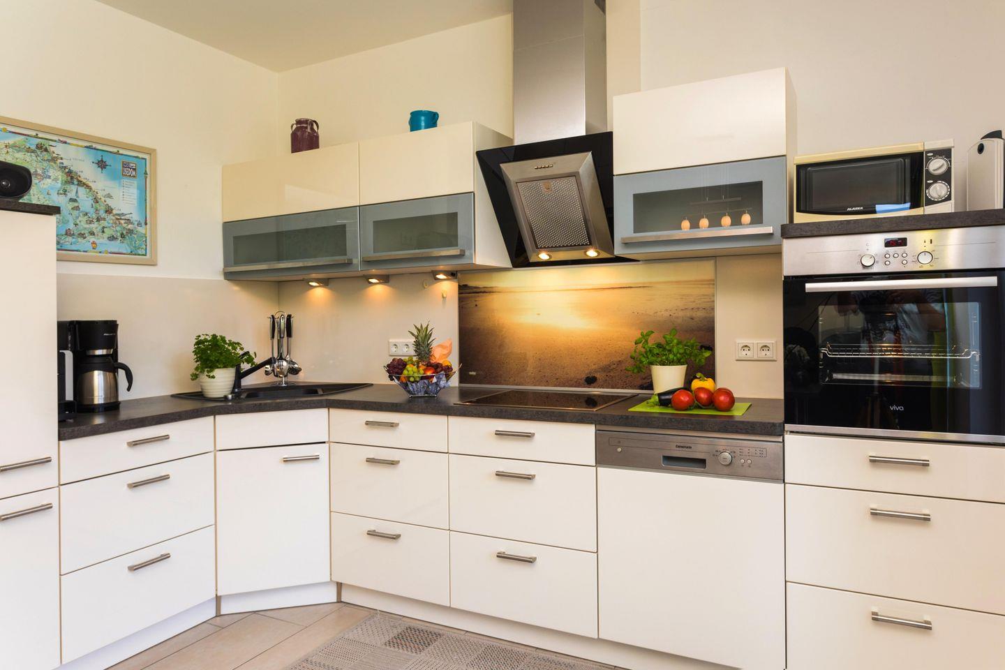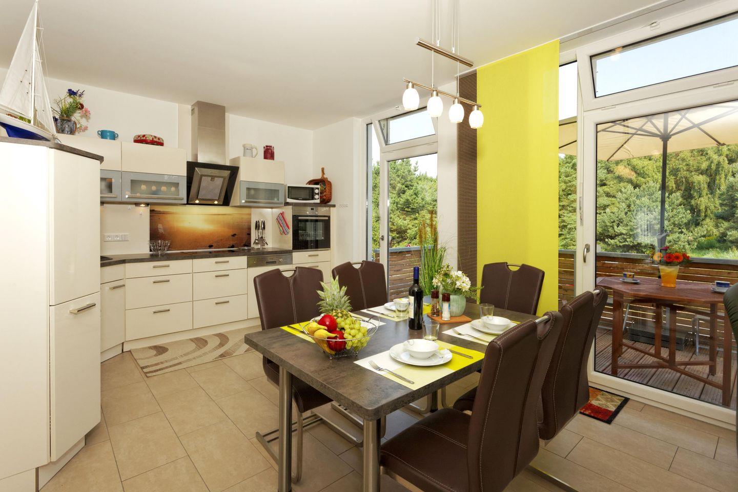 Die offen zum Wohnzimmer hin angelegte Küche lässt keine Wünsche offen und verfügt neben einem Ceranherd mit Elektroanschluss auch über einen Backofen, eine Mikrowelle und eine Spülmaschine. Weiterhin sind ein Kühlgefrierkombi, Kaffeemaschine, Wasserkocher sowie vollständiges Geschirr und Besteck vorhanden – für den komfortablen Start in den Tag oder gemeinsame Kochabende. Der angrenzende Essbereich mit Esstisch bietet Raum für Mahlzeiten und geselliges Beisammensein. Die zentrale Fußbodenheizung sorgt in allen Räumen jederzeit für angenehme Temperaturen, auch in der kühlen Jahreszeit.