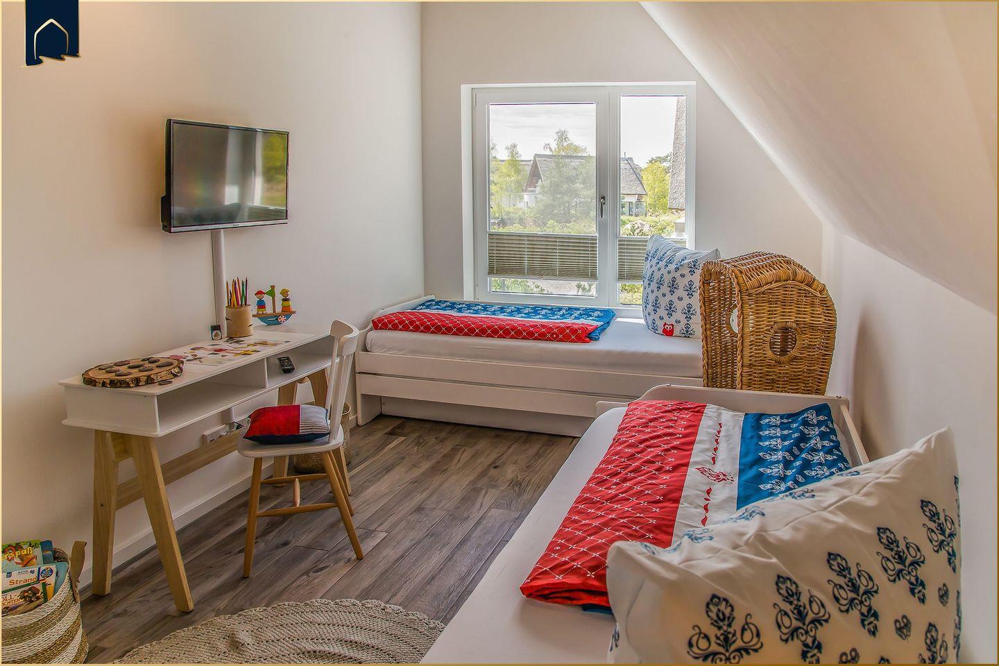 Für Familien mit Kindern ist das REETHÄUS`L besonders gut ausgestattet. Ein Treppenschutzrollo, ein stabiler Hochstuhl aus Holz, ein Kinderreisebett mit Matratze, eine Babywanne, ein Töpfchen, ein Fußtrittchen, ein Familien-WC-Sitz mit integrierter Kinderbrille sowie Kinderbesteck, Geschirr, Bücher und Spiele sorgen für stressfreie Urlaubstage. Im Garten steht außerdem ein kleines Holzhaus bereit, gefüllt mit Strandutensilien, Spielzeug und einem Bollerwagen, der für Ausflüge oder den kurzen Weg zum Strand ideal ist. Zwei PKW-Stellplätze sowie eine Unterstellmöglichkeit für Fahrräder runden die Ausstattung ab.