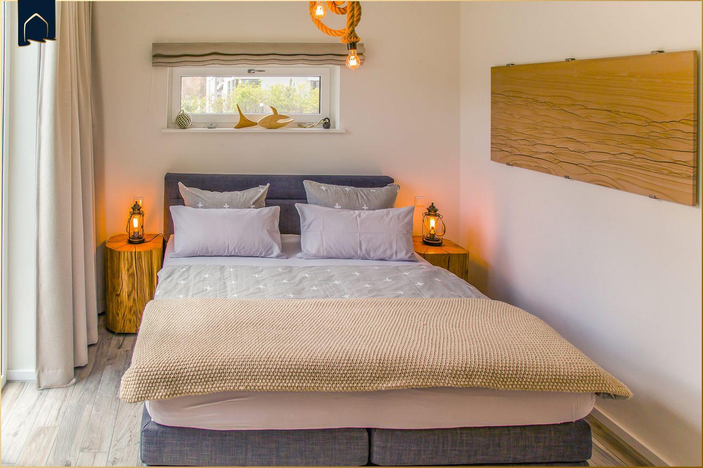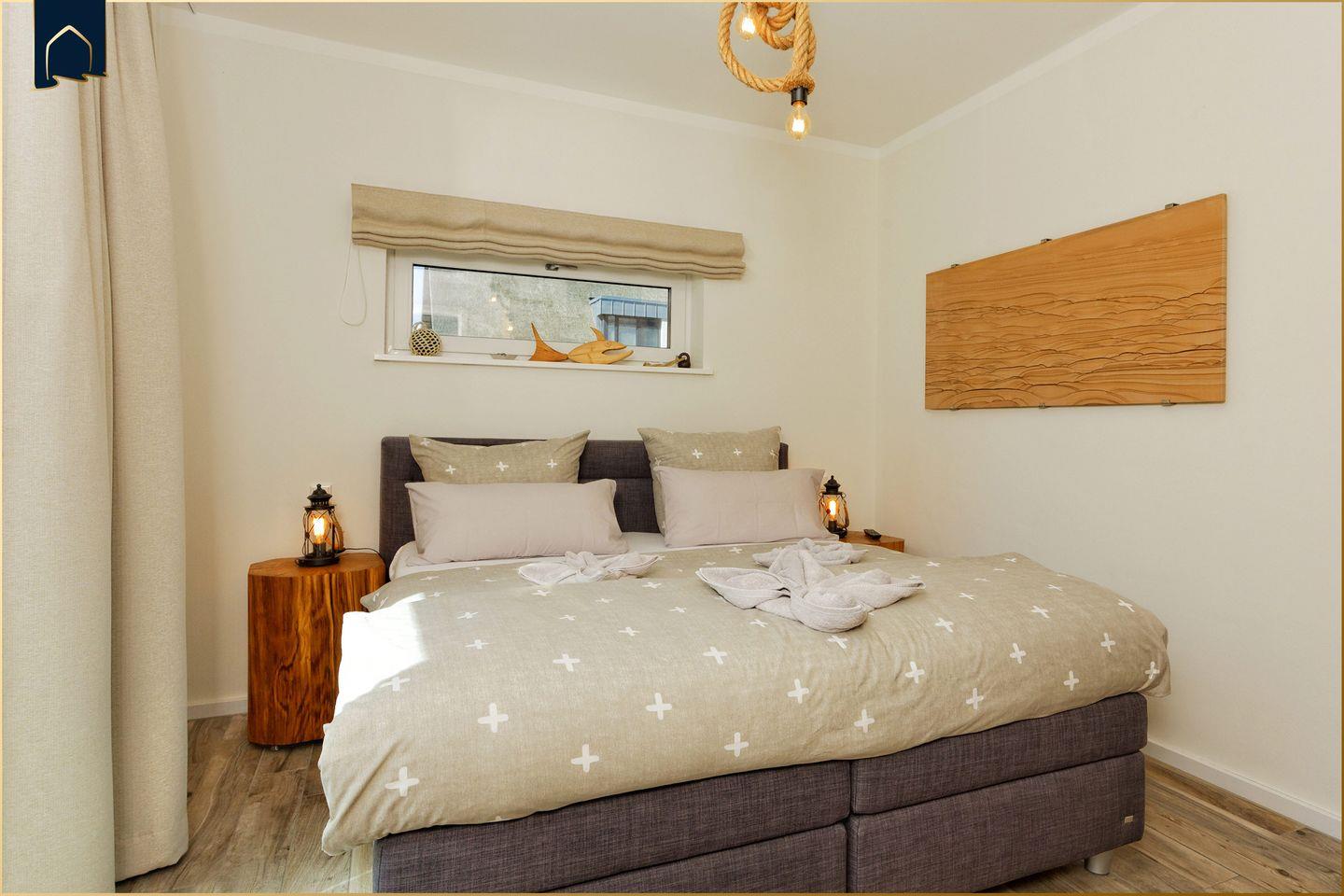 Im Erdgeschoss öffnet sich ein großzügiger Wohn- und Essbereich, der etwa 45 Quadratmeter umfasst und durch lichtdurchflutete Fensterfronten und eine Deckenhöhe von rund 2,82 Metern eine besondere Weite ausstrahlt. Der Wohnbereich lädt mit einer gemütlichen Sitzgruppe, einem Kamin mit 180-Grad-Panoramascheibe, einem großen Fernseher und einer Stereoanlage zu entspannten Stunden ein. Die hochwertige Echtholzküche mit AEG-Markengeräten bietet alles, was anspruchsvolle Hobbyköche benötigen – vom Induktionsherd und Backofen über Geschirrspüler, Mikrowelle, Kühl- und Gefrierschrank bis hin zu Kaffeemaschine, Toaster, Wasserkocher, Eierkocher und Mixer. Ein Schlafzimmer mit komfortablem Boxspringbett in Hotelqualität, TV und Safe sorgt bereits im Erdgeschoss für erholsame Nächte. Ergänzt wird die Etage durch ein modernes Badezimmer mit Natursteinwaschbecken und bodentiefer Dusche sowie einen Hauswirtschaftsraum mit Waschmaschine und Trocknerfunktion.