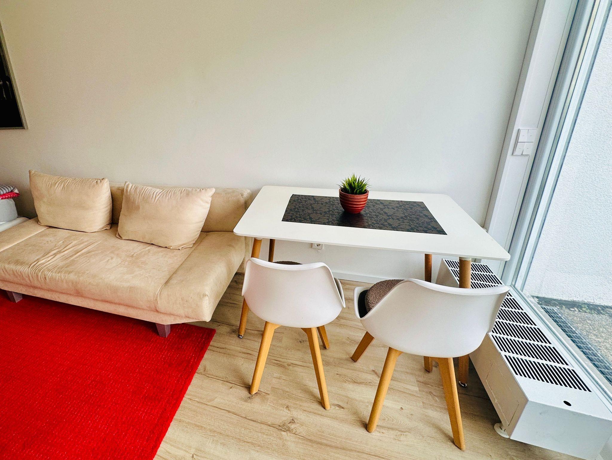 Der helle Wohnbereich lädt mit Sofa, Essplatz und Smart-TV zum Entspannen ein.