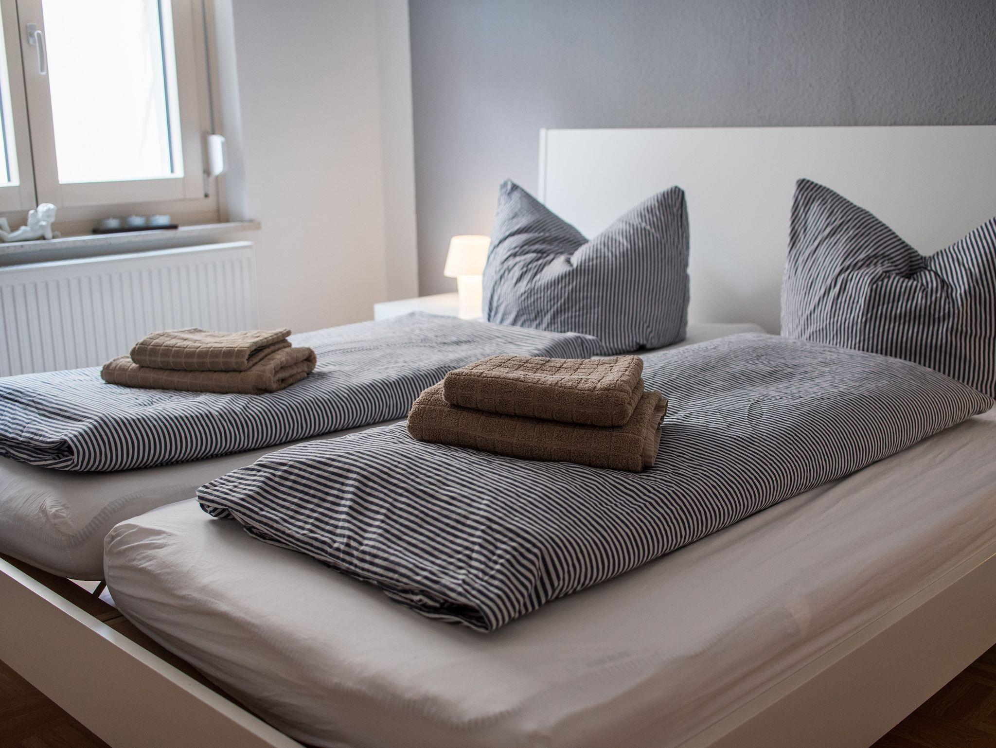 Die Zimmer sind mit TV, W-LAN, Geschirr und Handtüchern für 2 Personen ausgestattet. Weiterhin finden Sie einen Kühlschrank, Mikrowellen-/Backkombination und Wasserkocher vor.