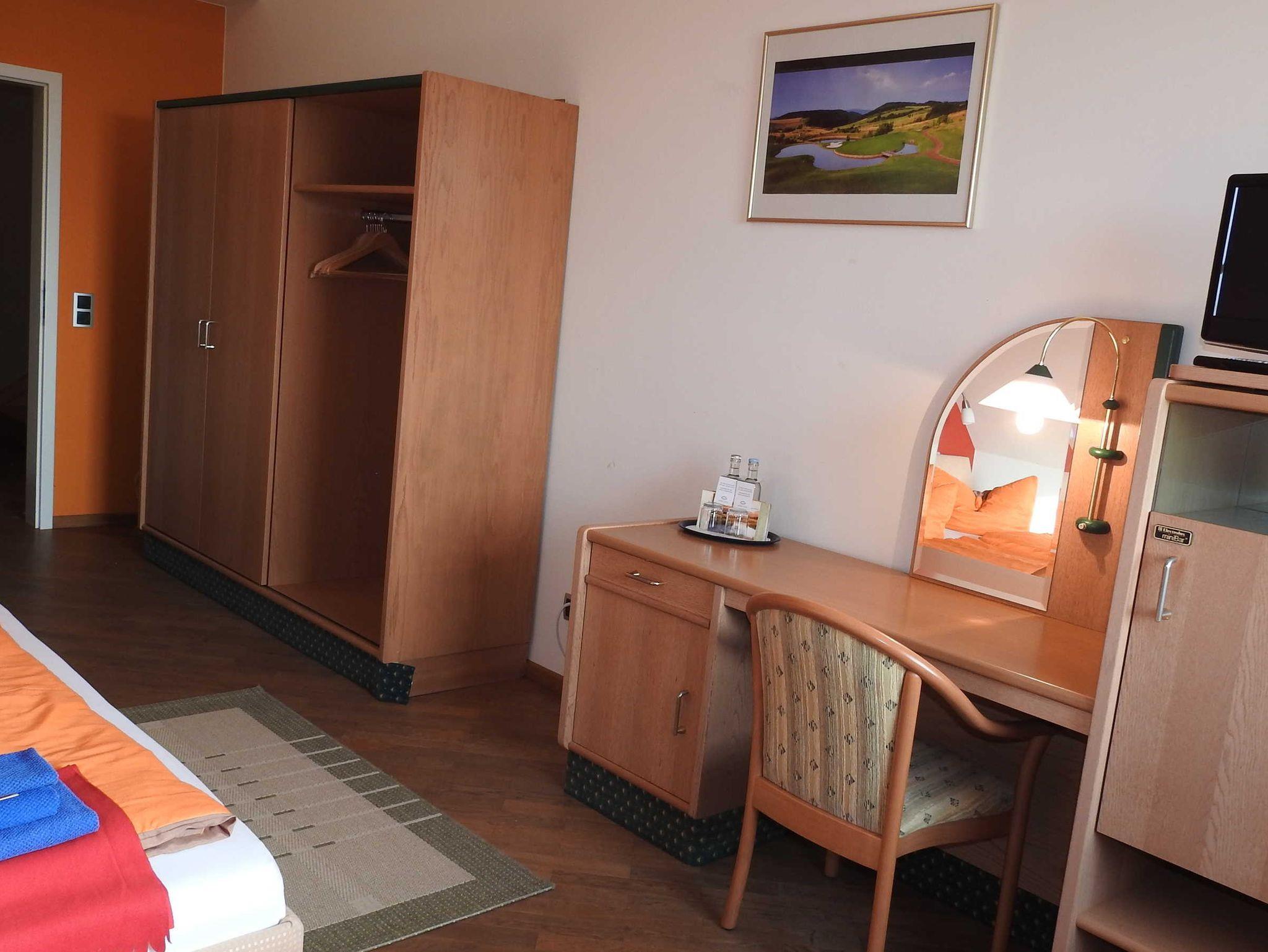 Doppelzimmer für 2 Personen mit Bad (Dusche/WC) und Blick auf den Golfplatz. Modern eingerichtet, Sat-TV und W-LAN Nutzung. Gern leihen wir Ihnen Bügelutensilien.