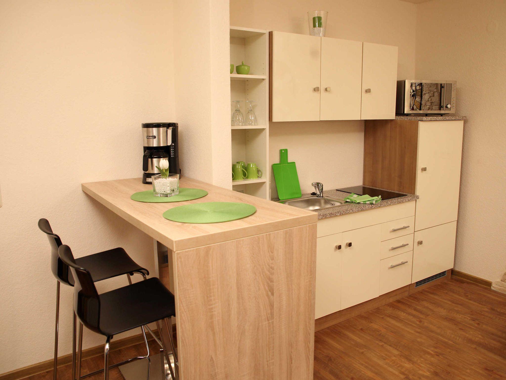 Im Koch- u. Ess-Bereich gibt es eine Küchenzeile mit moderner Ess-Theke. Das gemütliche und ruhige Schlafzimmer verfügt über ein großes Doppelbett (1,80m x 2,00m) und einen großen Kleiderschrank. Der Schlafbereich ist sehr ruhig mit Fenster zum Innenhof gelegen. Im modernen Bad befindet sich eine Dusche und ein WC sowie ein Waschbecken und eine Handtuchheizung.