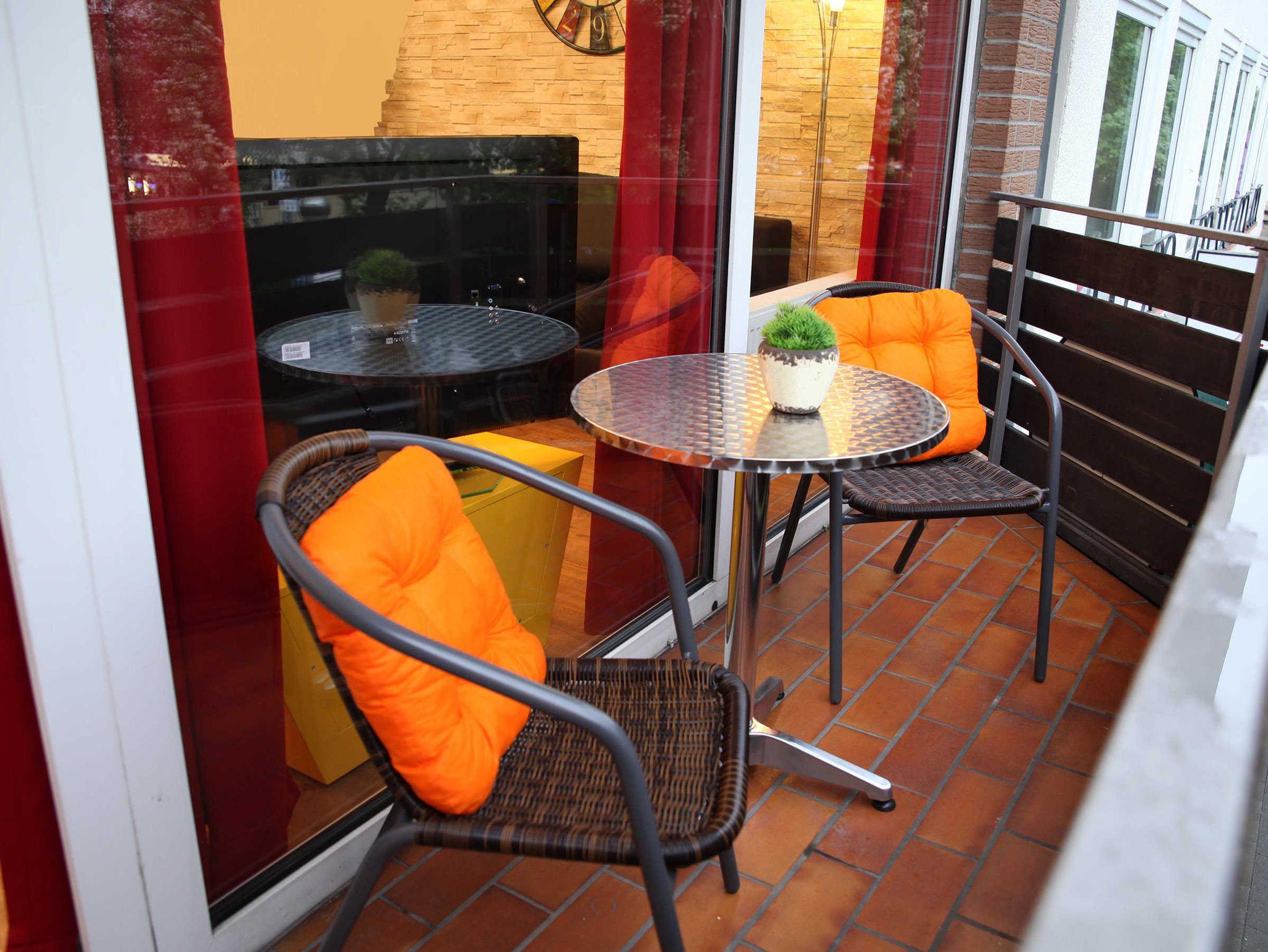 Der Süd-Balkon mit Tisch und Stühlen lädt zum Verweilen ein. Das kinderfreundliche Nichtraucher-Apartment besticht besonders durch seine individuelle Einrichtung mit modernen Möbeln.