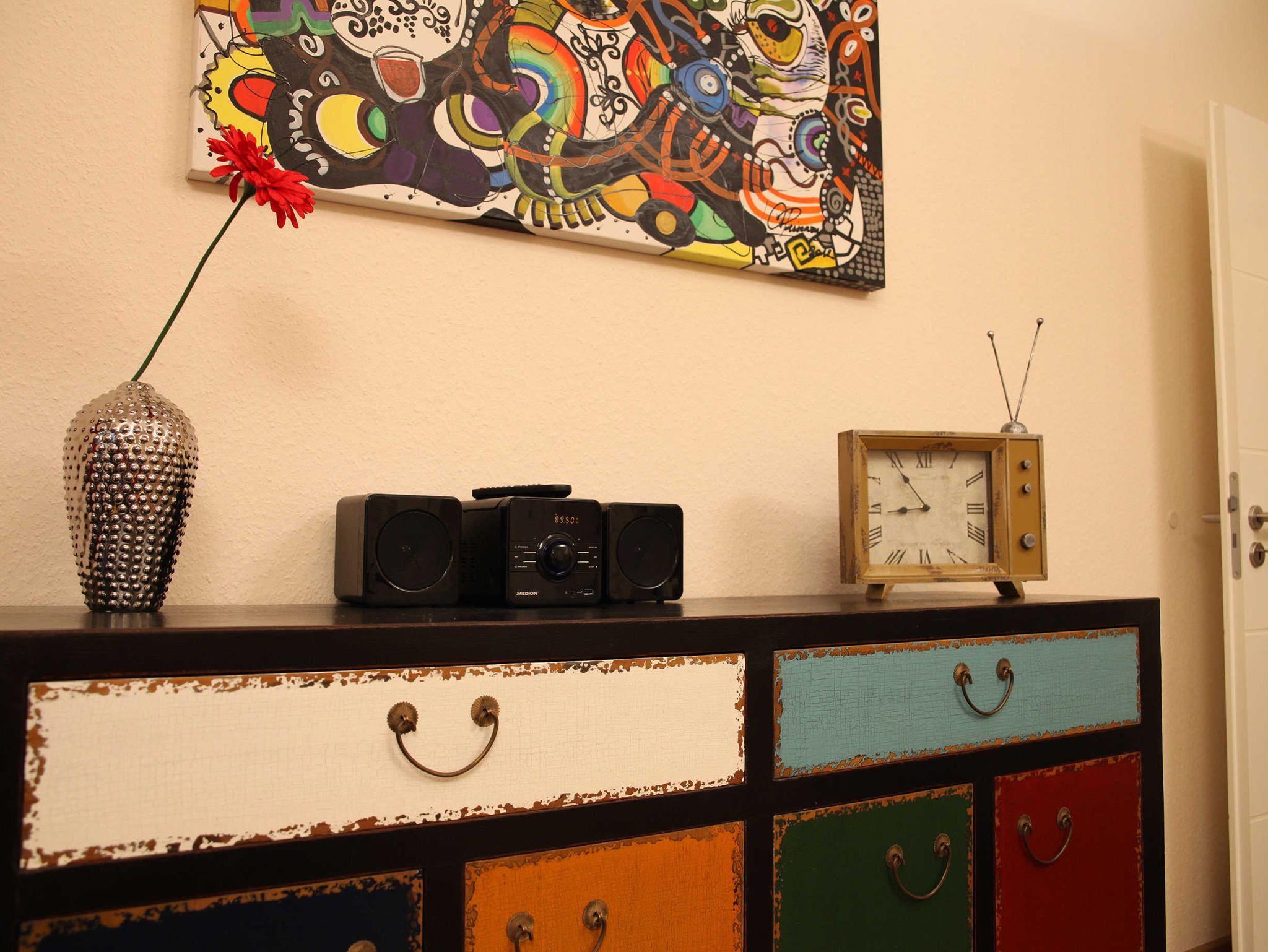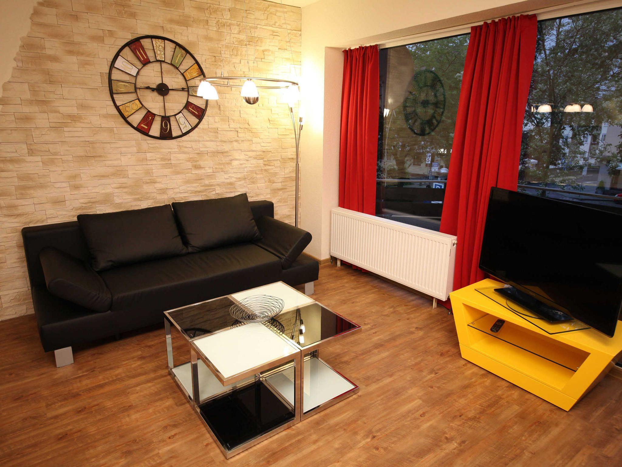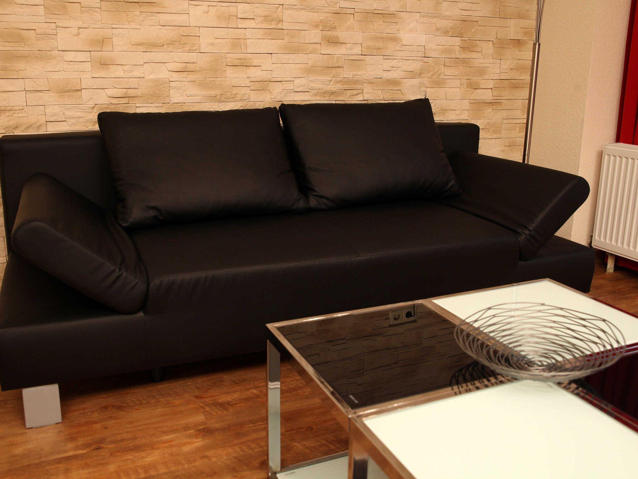 Das Wohnzimmer der Ferienwohnung ist mit einer ausziehbaren Schlafcouch mit Federkern ausgestattet. Hier ist ein Flachbild-TV, DVD-Player und eine Hifi-Anlage vorhanden.