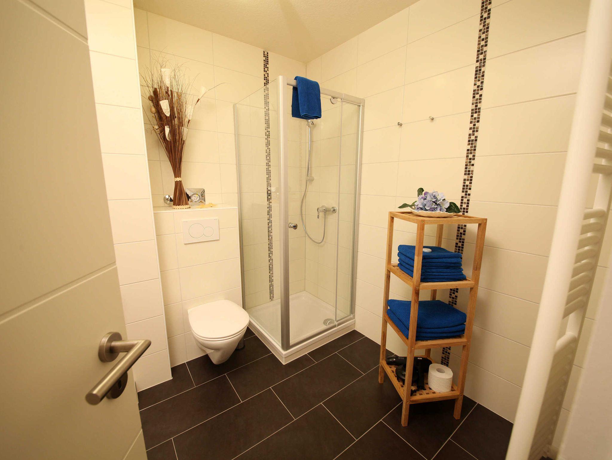 hat ein geräumiges modernes Bad mit Badewanne, extra Dusche, WC und Urinal