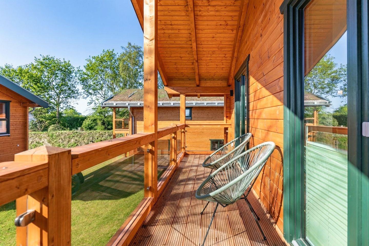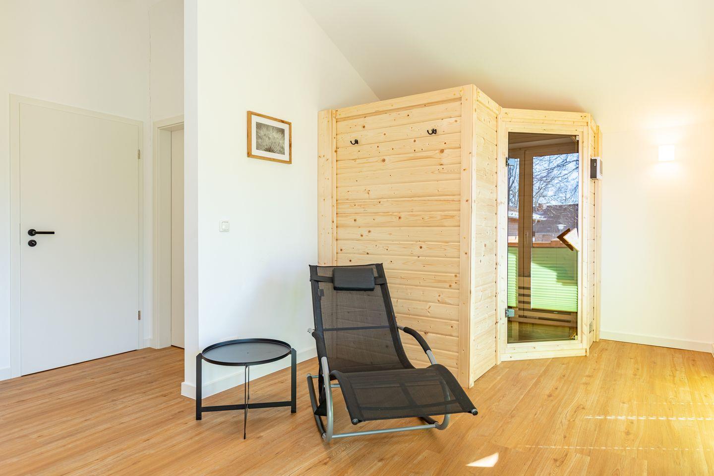 Gartenmöbel, ein Kugel-Holzkohlegrill, ein Strandkorb und ein Windschutz laden zu entspannten Stunden auf der Terrasse ein. Für Wellnessliebhaber steht eine eigene Sauna zur Verfügung – ideal, um nach einem aktiven Tag zur Ruhe zu kommen.