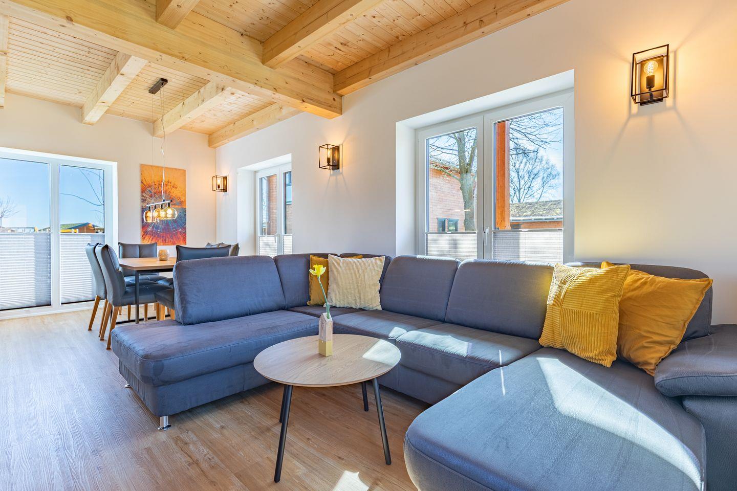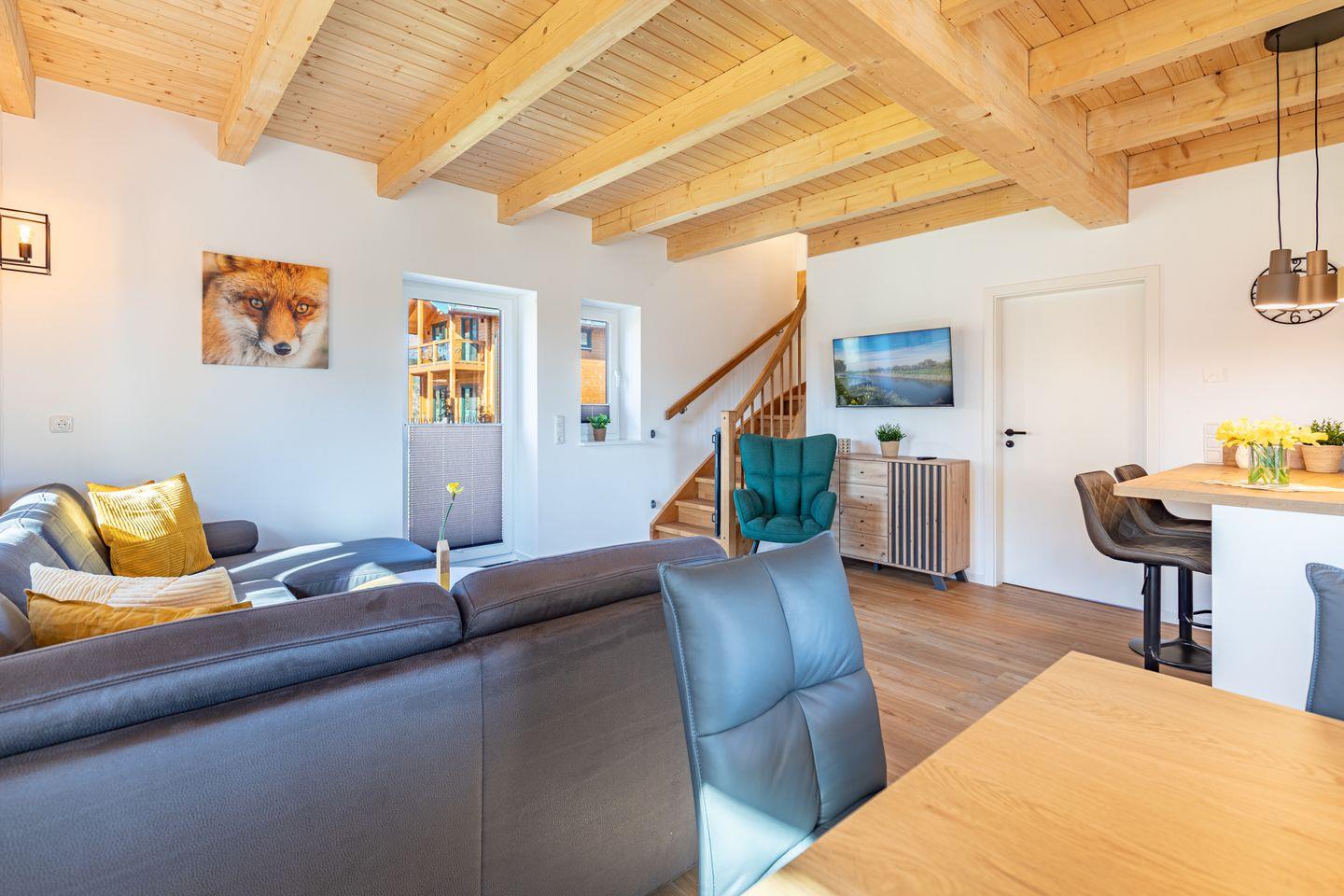 Die offene Küche ist voll ausgestattet mit Induktionskochfeld, Backofen, Mikrowelle, Spülmaschine, Senseo-Kaffeemaschine und Kühlschrank mit Gefrierfach – perfekt für gemeinsame Kochabende. Im gemütlichen Wohnbereich laden eine Sofaecke und ein SMART-Fernseher zum Verweilen ein. Kostenloses, schnelles WLAN hält Sie jederzeit online. Der angrenzende Essbereich bietet ausreichend Platz für alle Gäste.
