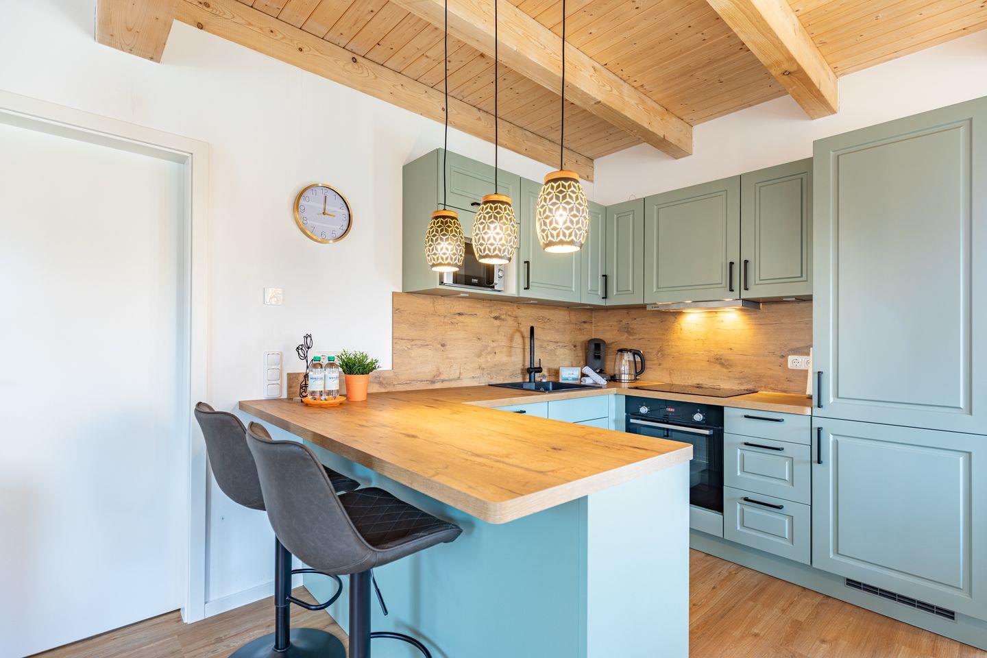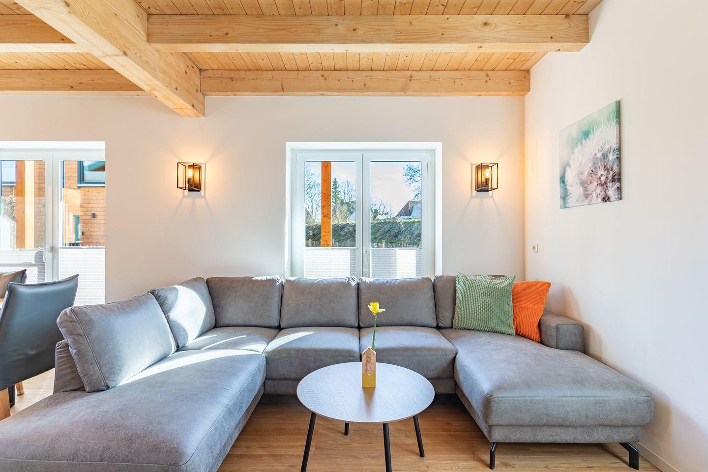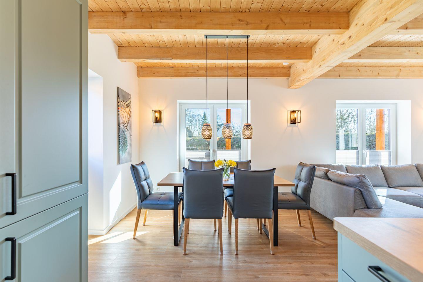 Die offene Küche ist voll ausgestattet mit Induktionskochfeld, Backofen, Mikrowelle, Spülmaschine, Senseo-Kaffeemaschine und Kühlschrank mit Gefrierfach – perfekt für gemeinsame Kochabende. Im gemütlichen Wohnbereich laden eine Sofaecke und ein SMART-Fernseher zum Verweilen ein. Kostenloses, schnelles WLAN hält Sie jederzeit online. Der angrenzende Essbereich bietet ausreichend Platz für alle Gäste.