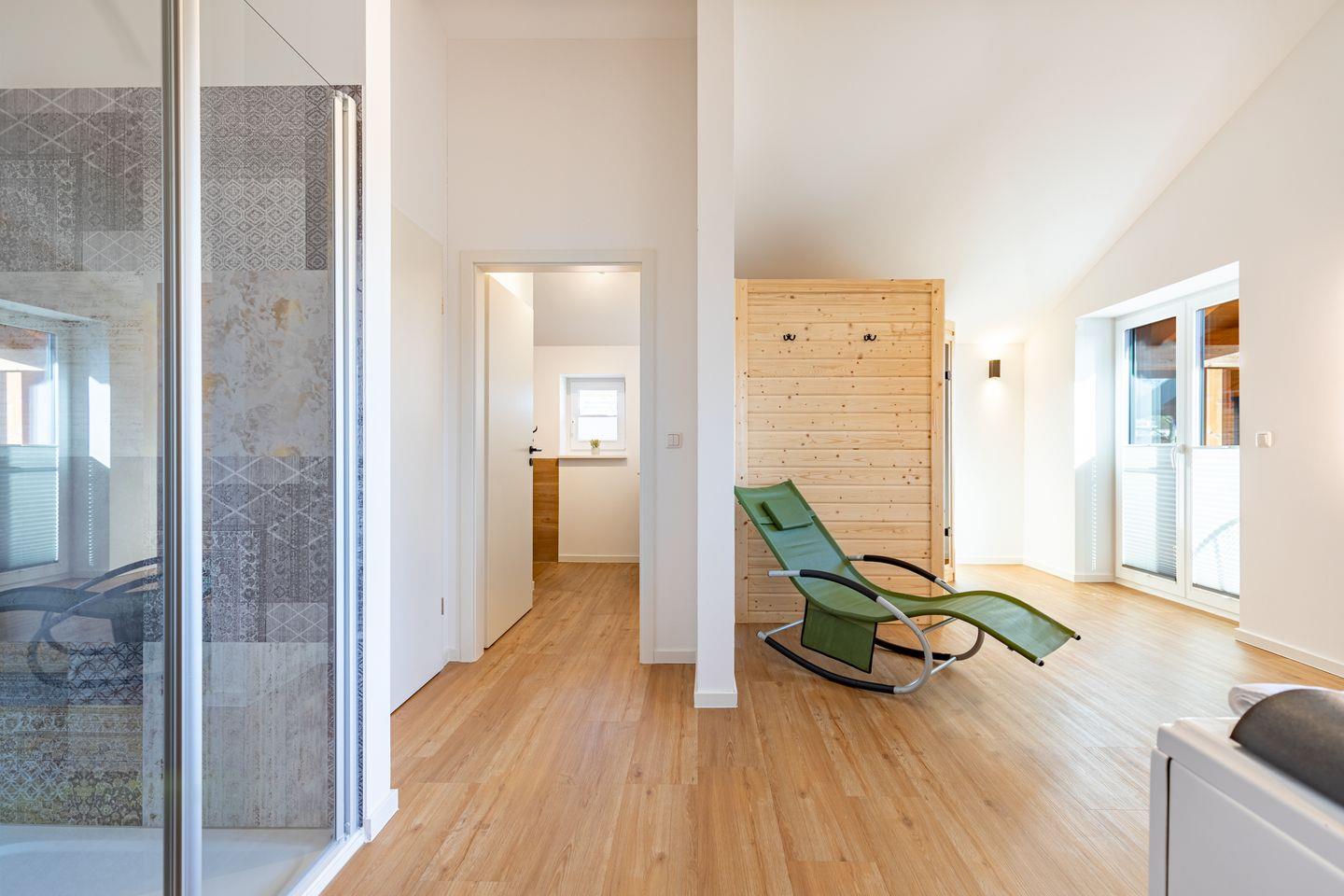 Ein modernes Badezimmer mit bodengleicher Dusche, WC sowie Sauna und einem Whirlpool sorgen für besonderen Komfort. Ein echtes Highlight ist der angrenzende Balkon mit wunderbarer Aussicht über das Katinger Watt!