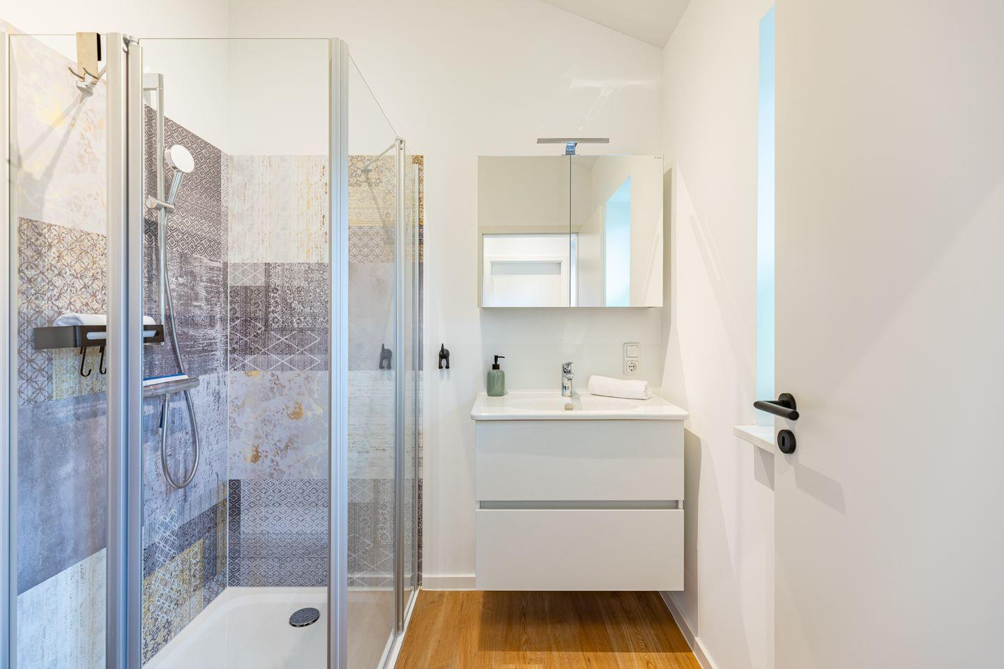 Ein modernes Badezimmer mit bodengleicher Dusche, WC und Sauna sorgen für besonderen Komfort.