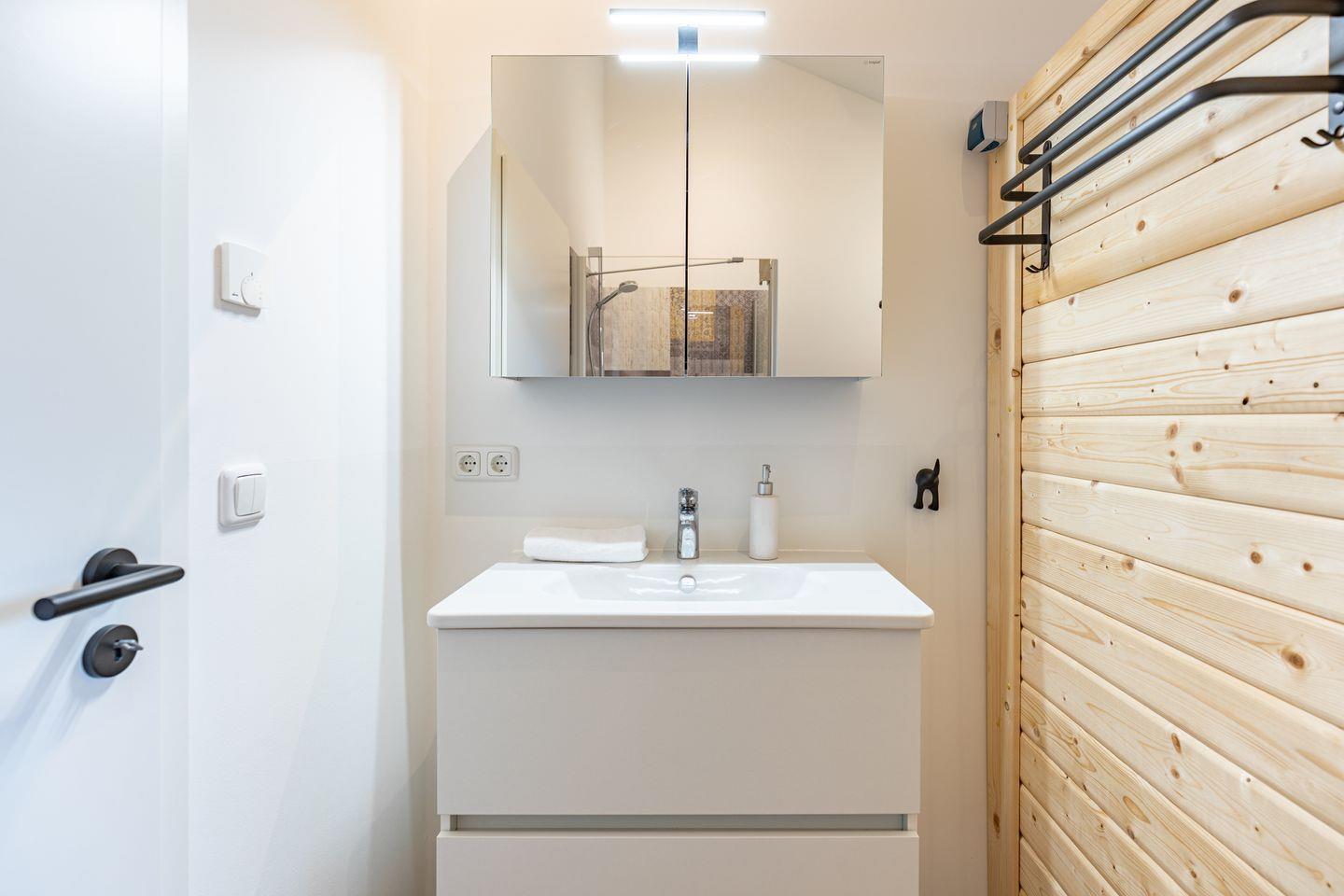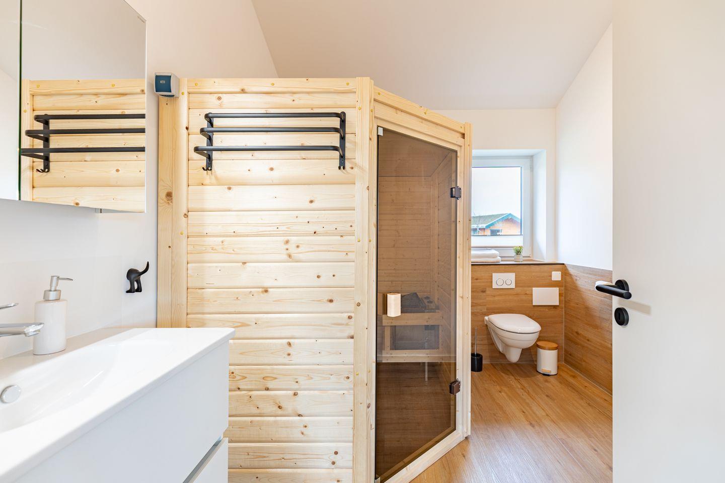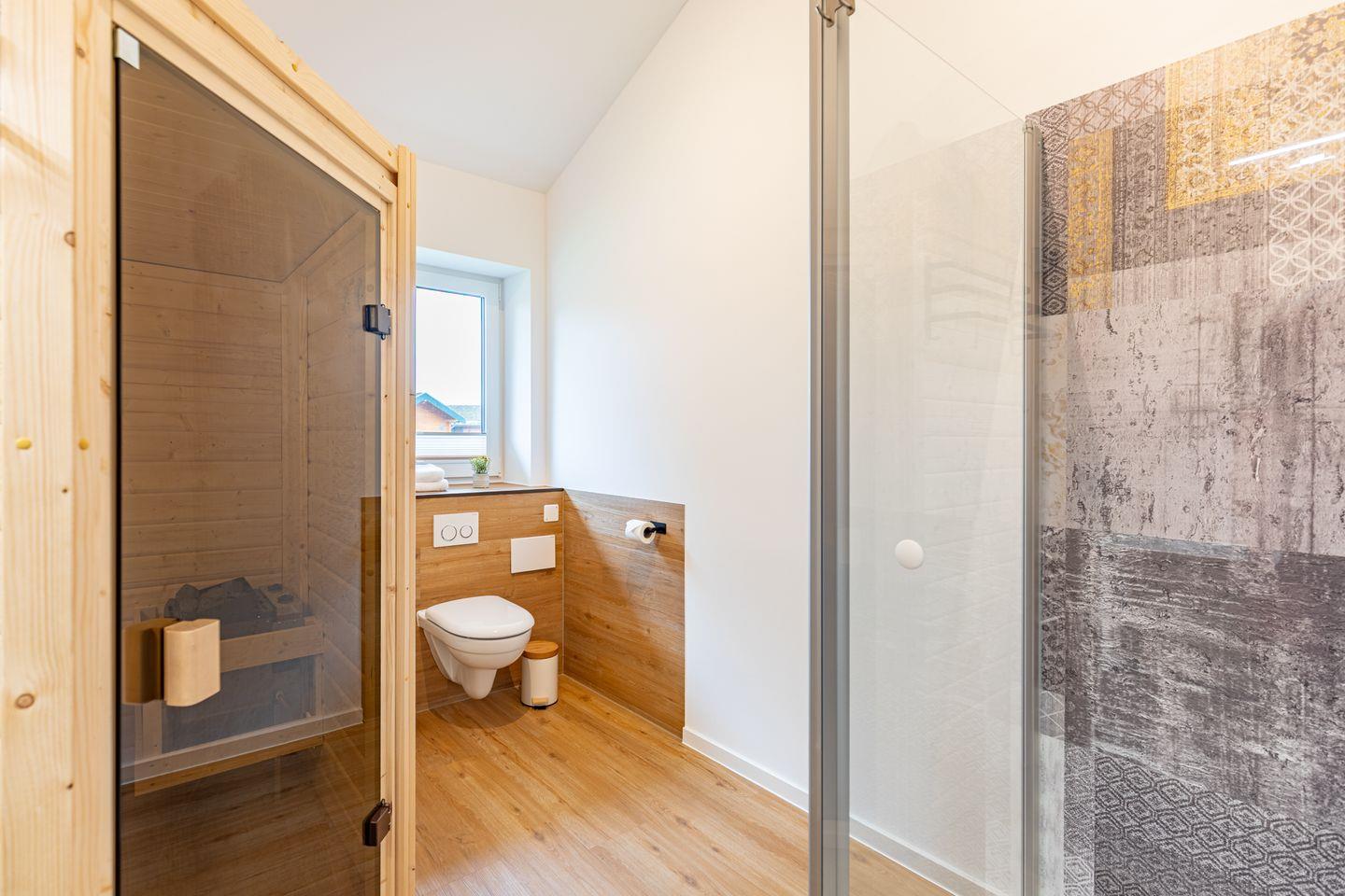 Ein modernes Badezimmer mit bodengleicher Dusche, WC und Sauna sorgen für besonderen Komfort.