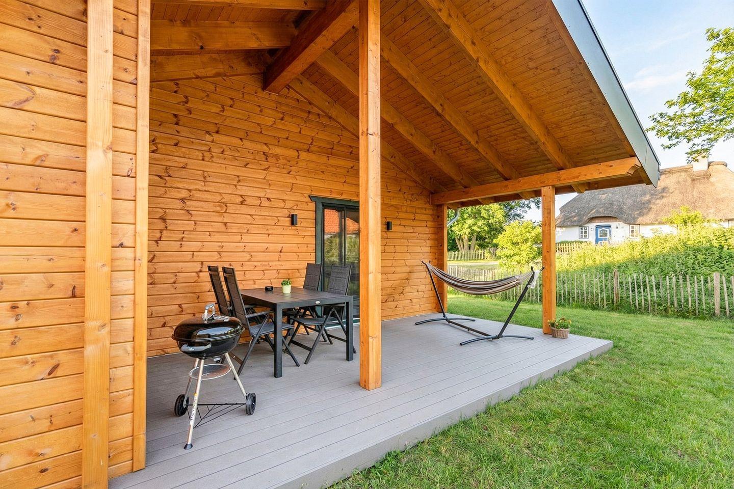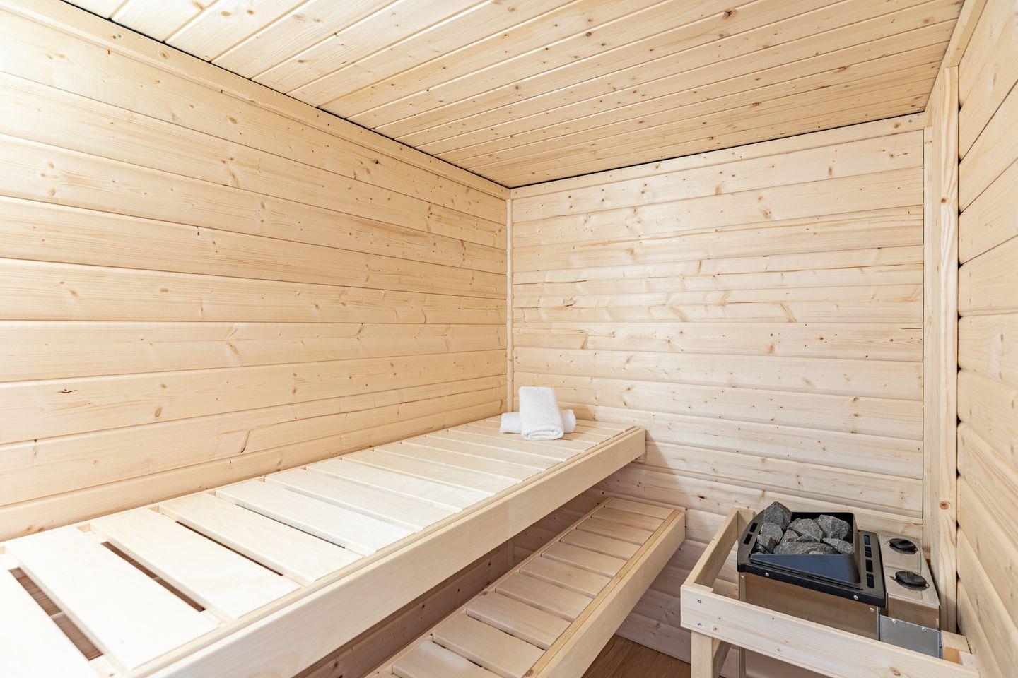 Gartenmöbel, ein Kugel-Holzkohlegrill und ein Windschutz laden zu entspannten Stunden auf der Terrasse ein. Für Wellnessliebhaber steht eine eigene Sauna zur Verfügung – ideal, um nach einem aktiven Tag zur Ruhe zu kommen.