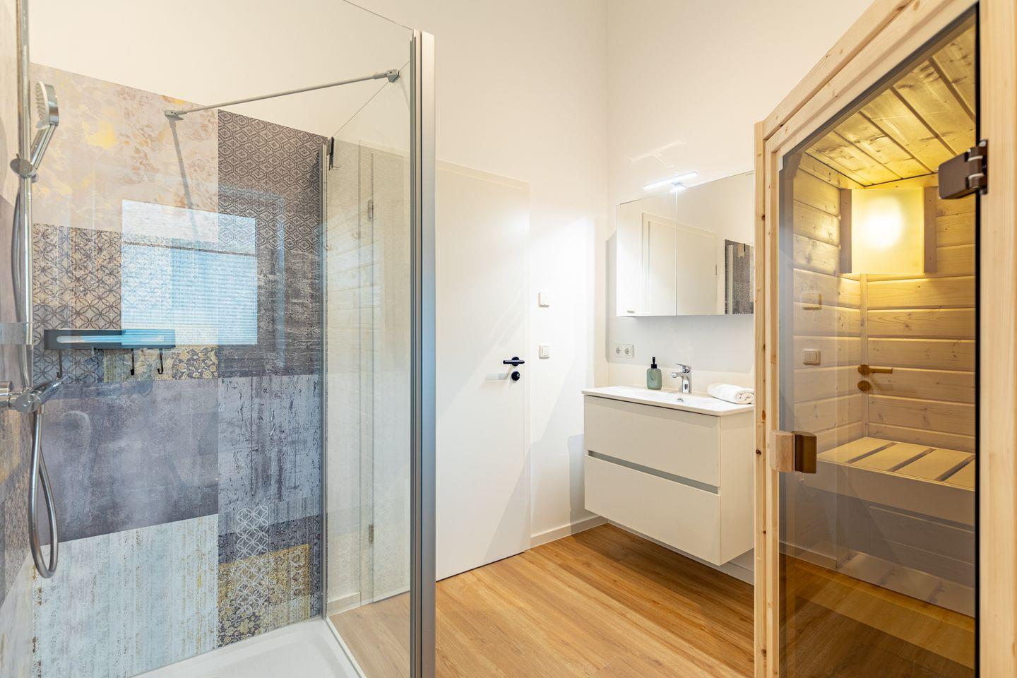 Ein modernes Badezimmer mit bodengleicher Dusche, WC und Sauna sorgen für besonderen Komfort.