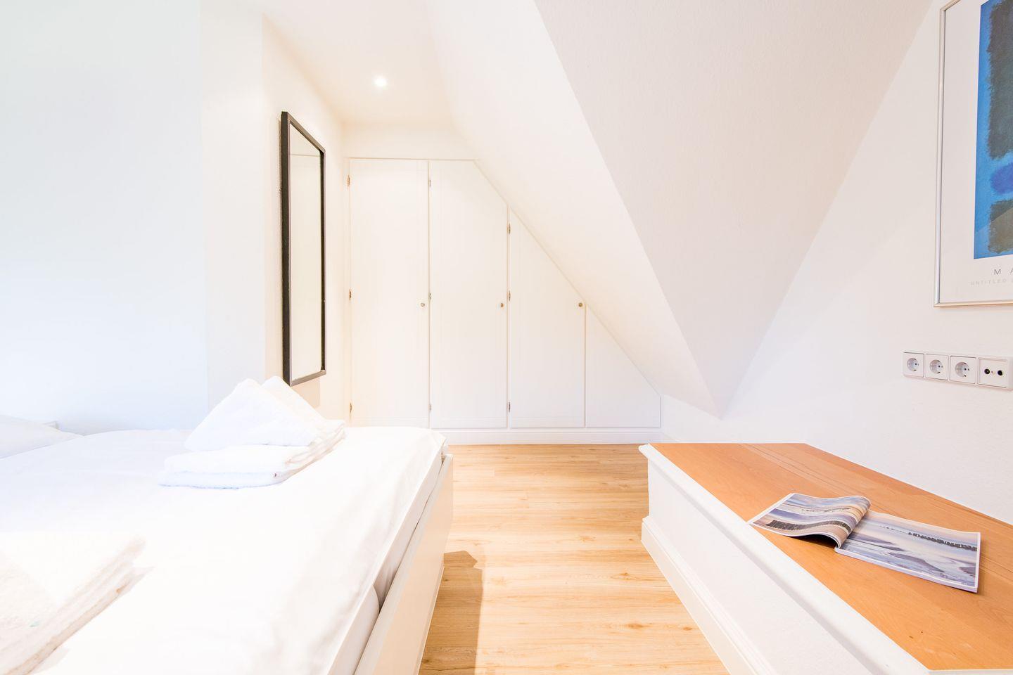 Das Schlafzimmer verfügt über ein komfortables Doppelbett (180x200 cm) und großzügige Einbauschränke, die ausreichend Stauraum für Ihre Garderobe bieten. Hier können Sie entspannte Nächte verbringen und erholt in den neuen Tag starten.