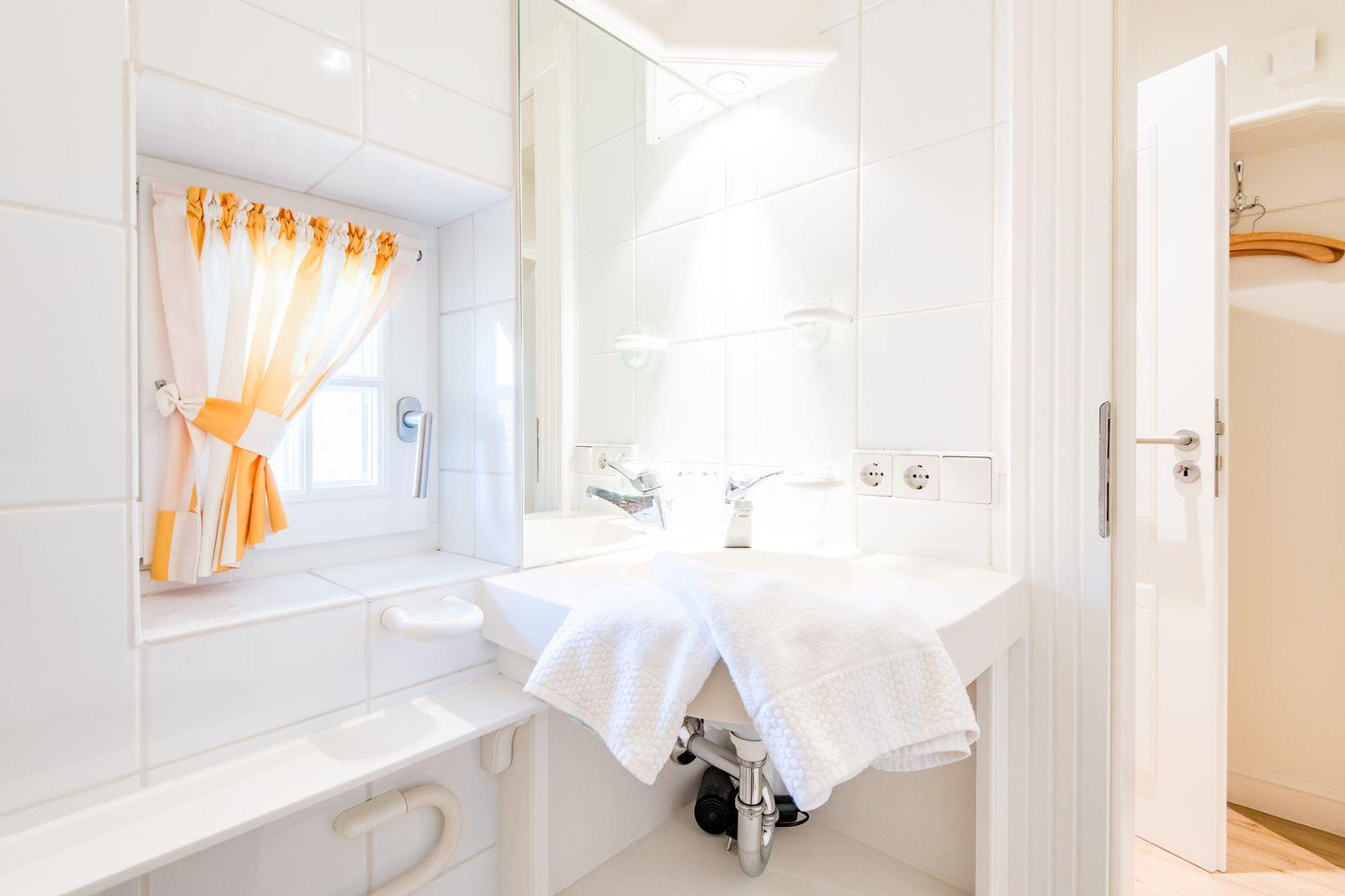 Das stilvolle Badezimmer ist mit einer Dusche, WC und einem Handtuchwärmer ausgestattet und bietet mit seinem Tageslicht eine angenehme Atmosphäre. Hier starten Sie erfrischt in den Tag oder können nach einem erlebnisreichen Tag auf der Insel entspannen.