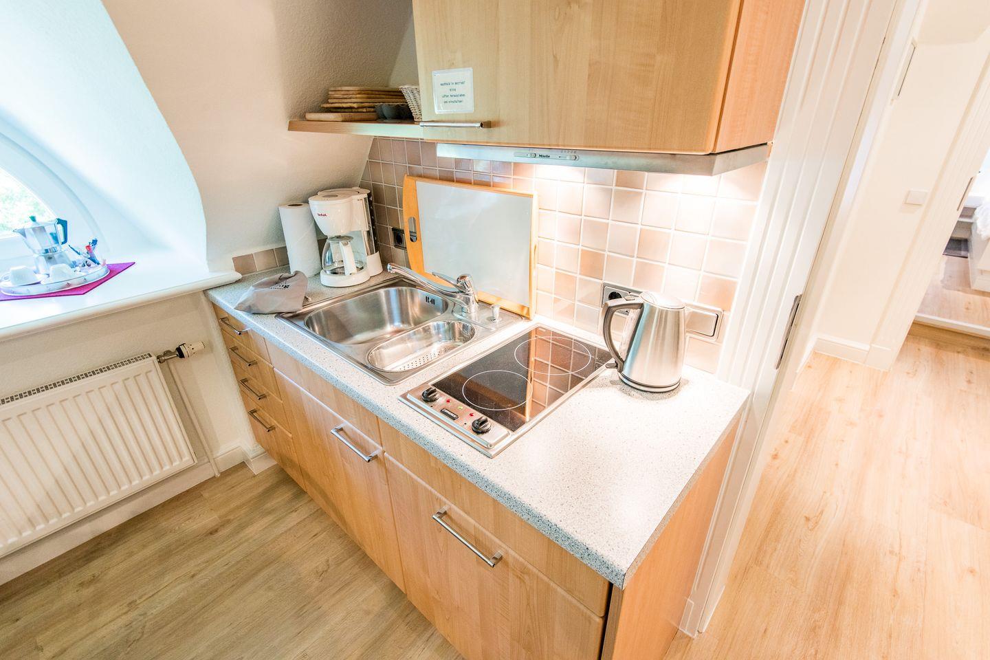 Die offene Küche ist funktional und modern ausgestattet und bietet alles, was Sie für die Zubereitung Ihrer Mahlzeiten benötigen. Mit einem 2-Flammen-Herd, einer Nespresso-Kapselmaschine, einer Filterkaffeemaschine und weiteren modernen Geräten haben Sie alles zur Hand, um sich während Ihres Aufenthalts selbst zu versorgen.