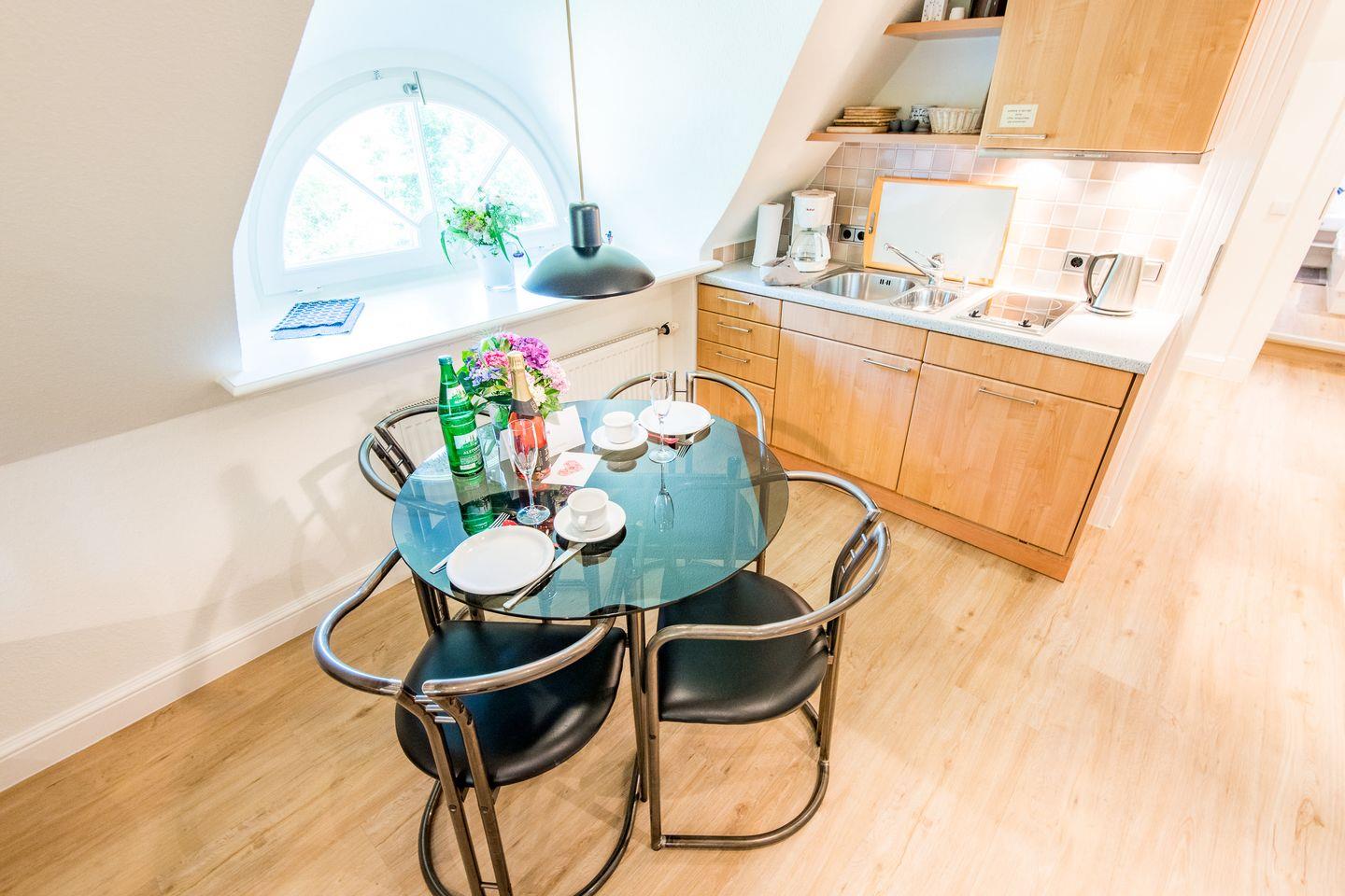 Der Wohnbereich ist mit einer gemütlichen Couch, einem bequemen Sessel und einem TV ausgestattet und bietet den perfekten Ort, um nach einem langen Tag am Strand oder in der Natur zu entspannen. Ein liebevoll gestalteter Essbereich für zwei Personen lädt zu gemeinsamen Mahlzeiten ein und bietet eine gemütliche Atmosphäre.