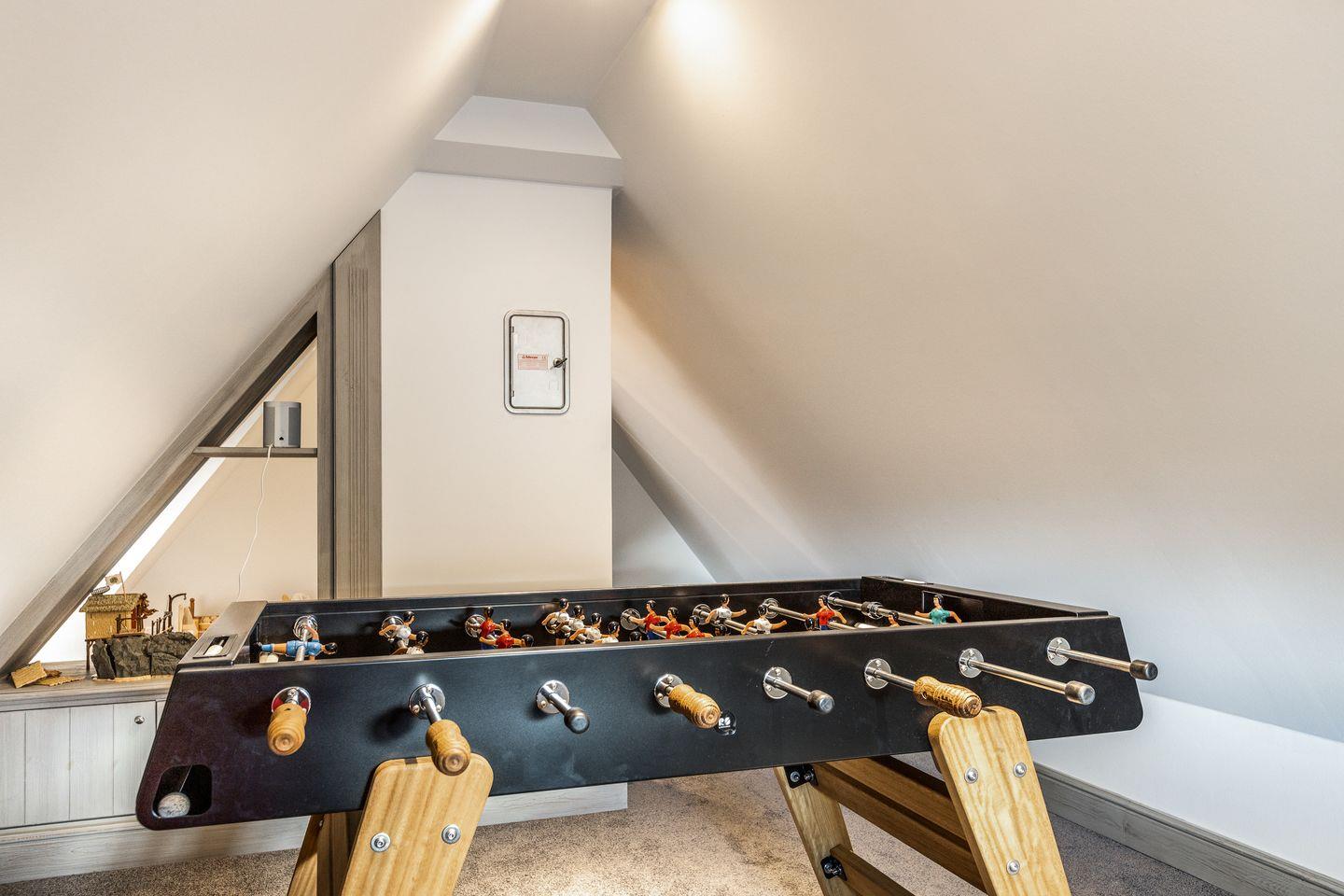 Ein zusätzlicher Fitnessbereich und ein Spielzimmer mit Tischkicker, Kuschelecke und Kinderspielzeug bieten Unterhaltung für alle Altersgruppen, drei Heimkino-Systeme (Wohnzimmer, Küche und Spa) und die Sonos-Soundanlage sorgen für maximale Entspannung und Unterhaltung.