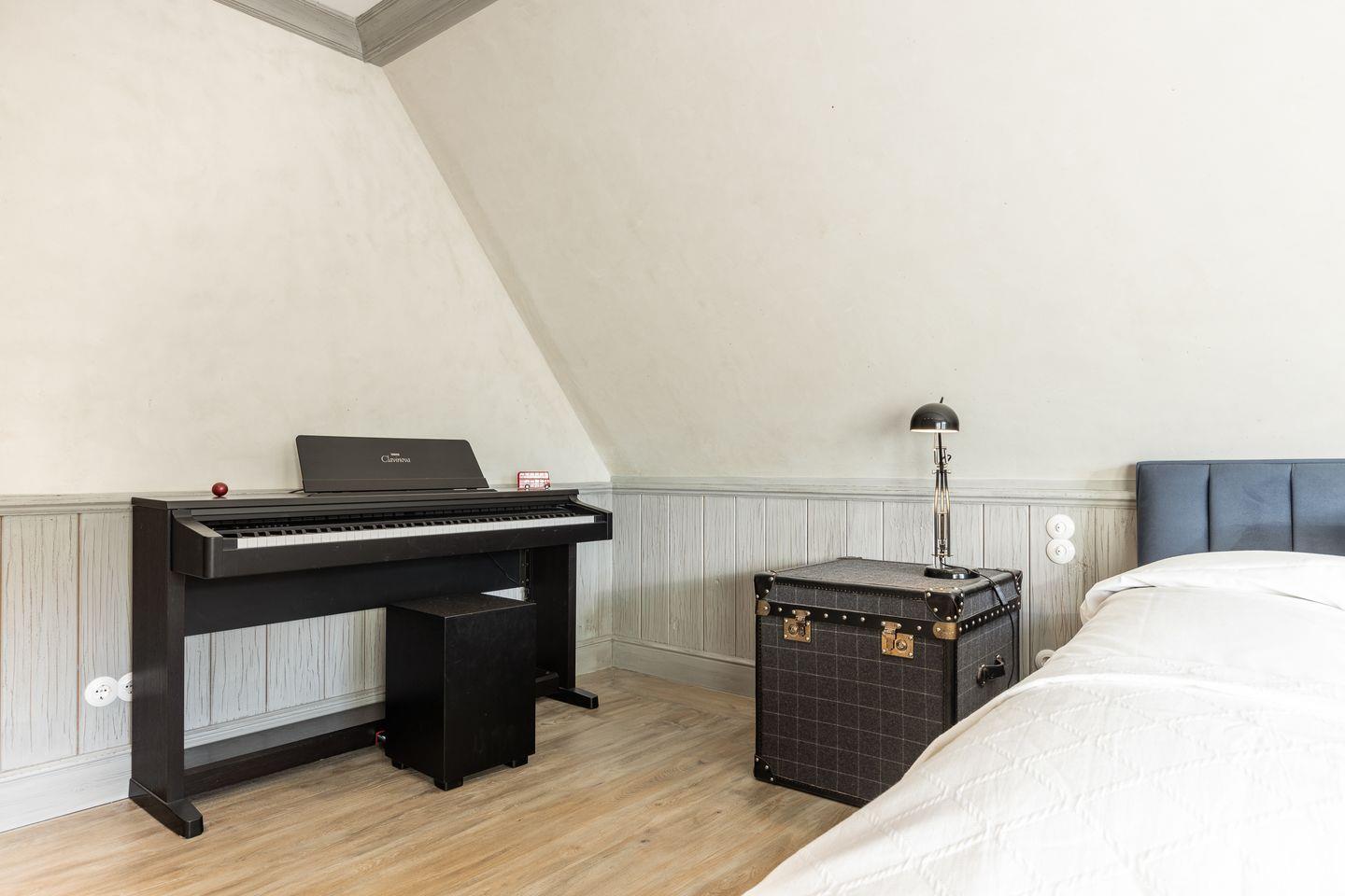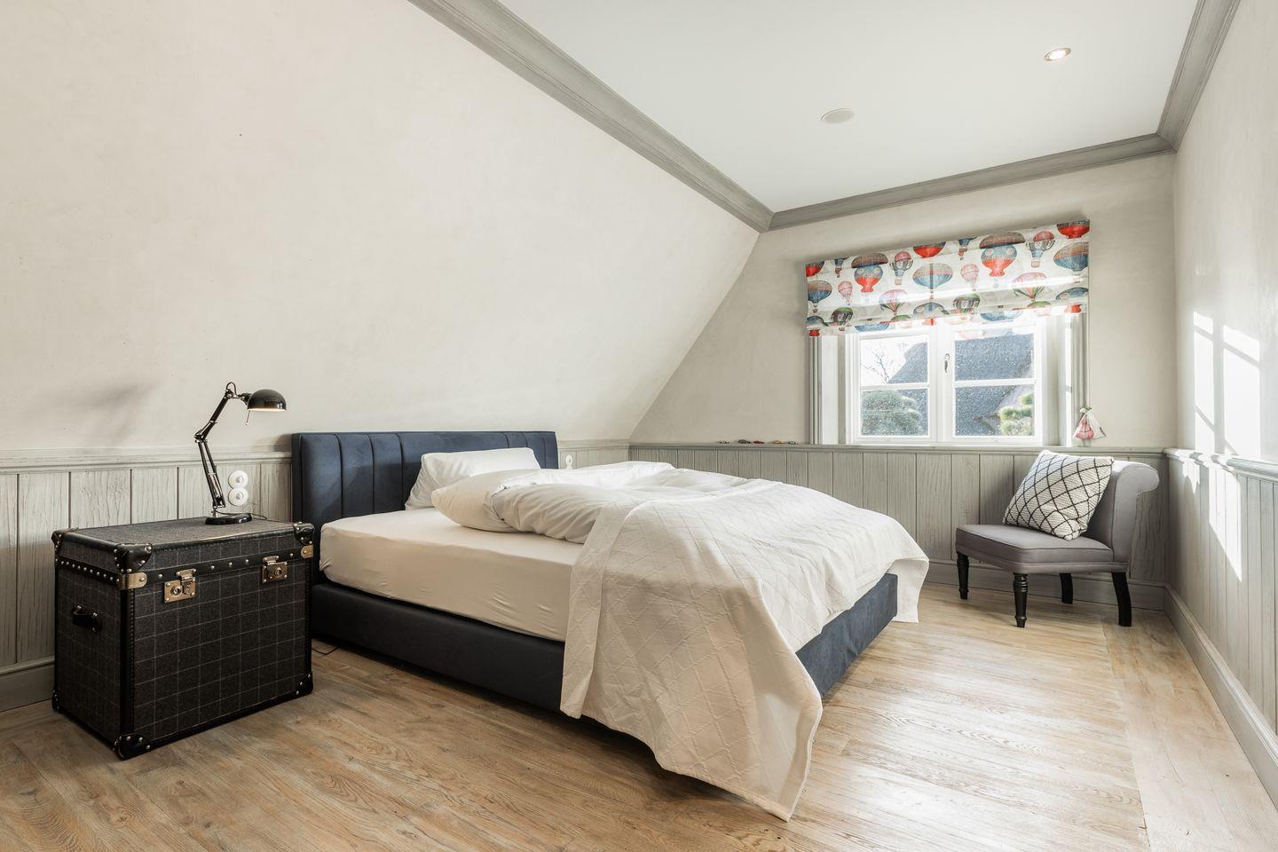 Die fünf Schlafzimmer bieten höchsten Komfort und stilvolle Details. Zwei Schlafzimmer sind mit Boxspringbetten (180x200 cm) und Kommoden ausgestattet. Zwei weitere Schlafzimmer verfügen über großzügige Boxspringbetten (200x200 cm) und begehbare Kleiderschränke sowie ein eigenes en suite Badezimmer. Ein fünftes Schlafzimmer mit Boxspringbett (180x200 cm) und einem Reiseschrank bietet zusätzlichen Schlafraum.