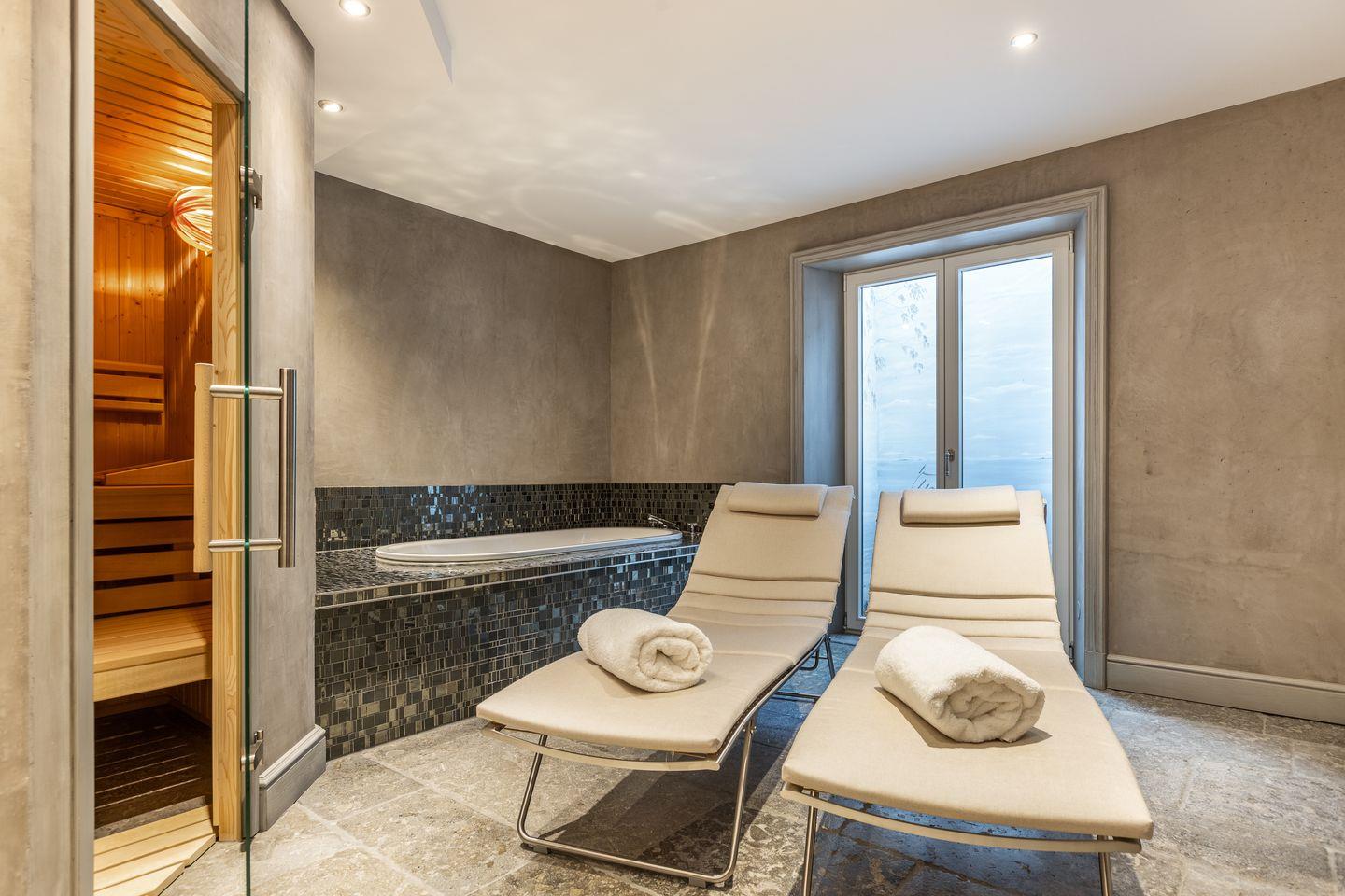 Das Haus verfügt über drei hochwertige Badezimmer mit Regenduschen sowie zwei separate Gäste-WCs. Der großzügige Wellnessbereich umfasst eine Sauna, eine Dampfsauna mit Regendusche, eine Whirlbadewanne und Ruheliegen – ein perfekter Rückzugsort für entspannende Stunden.