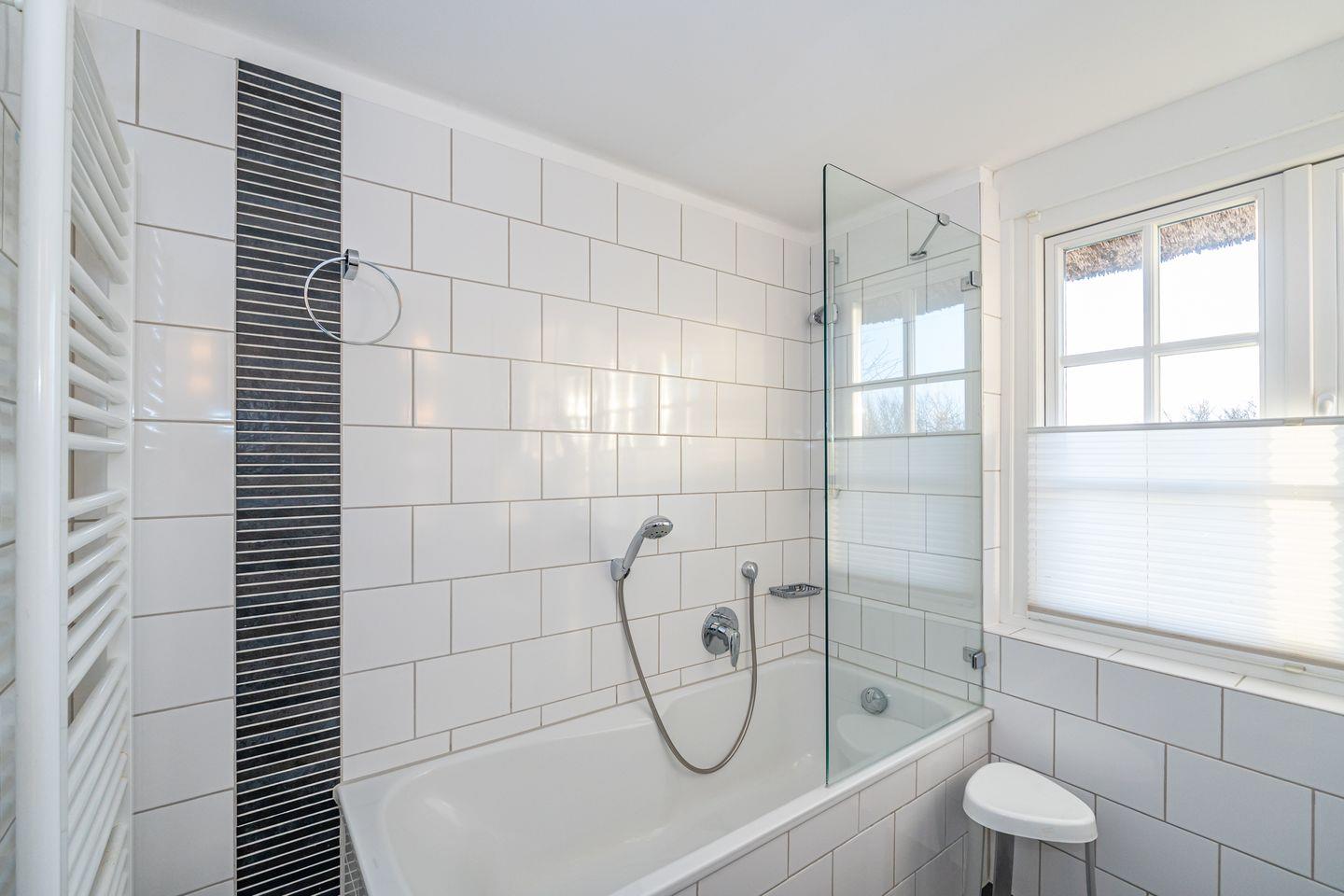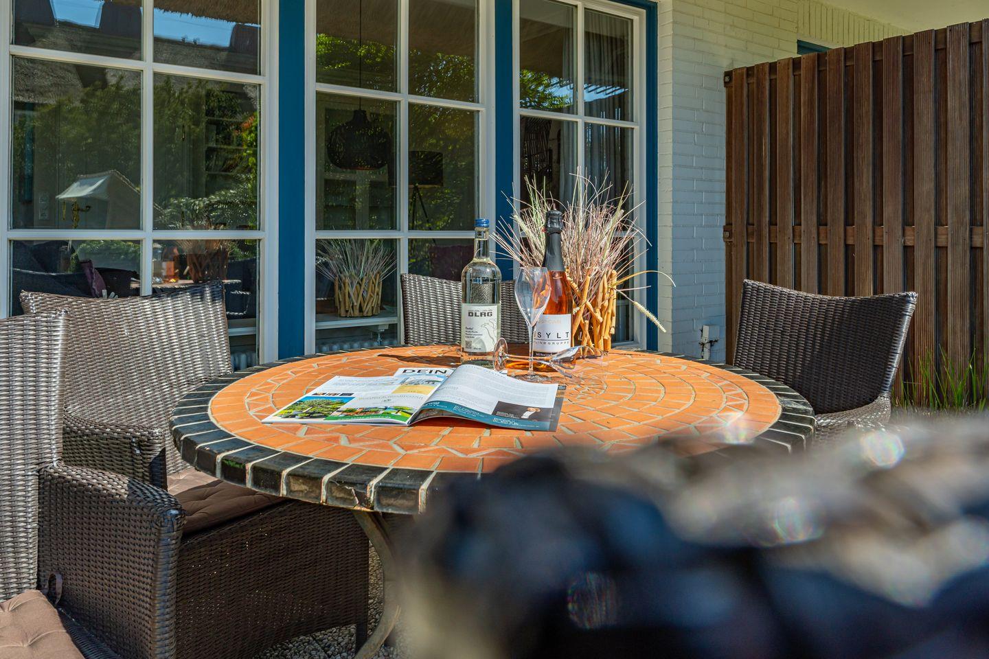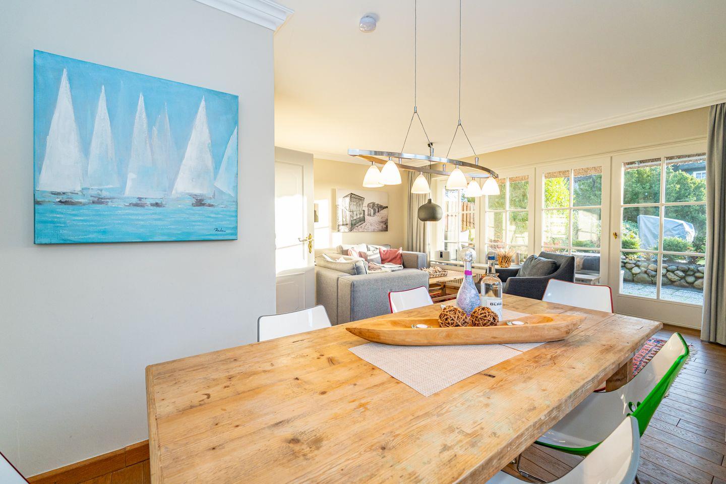 In Keitum erwartet Sie die wunderschöne Ferienhaushälfte, für die ganze Familie. Das Wohnzimmer verfügt über ein Sofa und TV. Es ist ausgestattet mit einer raffinierter Durchreiche zur separaten Küche, mit Geschirrspüler, Mikrowelle, Herd und Backofen. Vom Wohnzimmer aus gelangen Sie auf die möblierte Terrasse mit Stühlen und