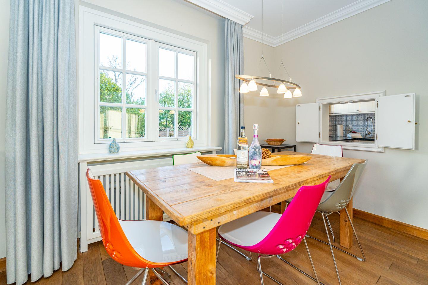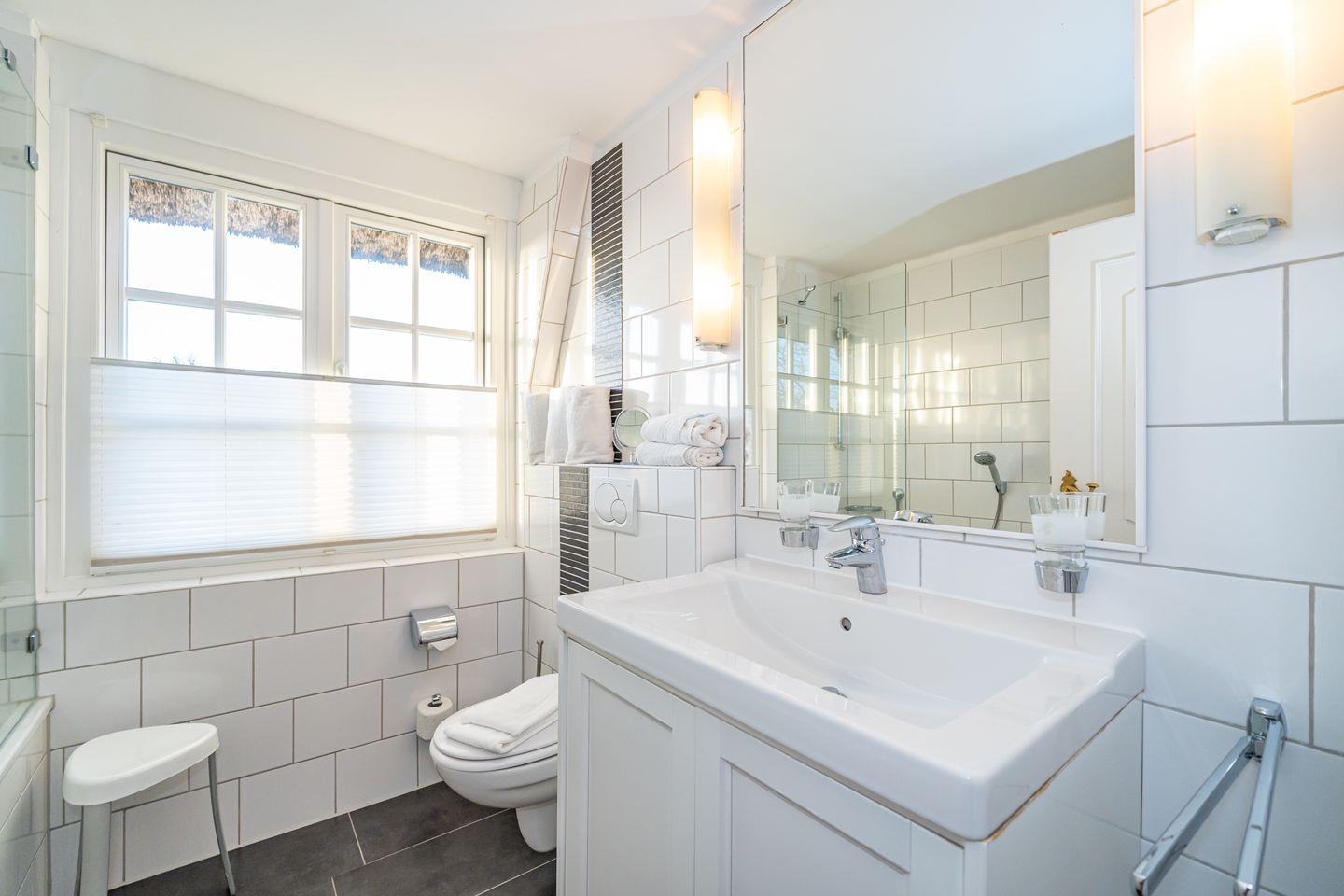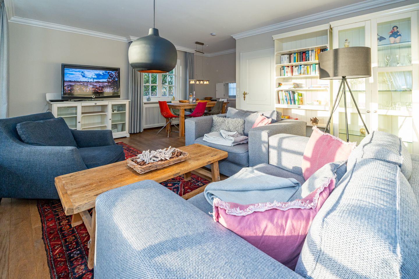 In Keitum erwartet Sie die wunderschöne Ferienhaushälfte, für die ganze Familie. Das Wohnzimmer verfügt über ein Sofa und TV. Es ist ausgestattet mit einer raffinierter Durchreiche zur separaten Küche, mit Geschirrspüler, Mikrowelle, Herd und Backofen. Vom Wohnzimmer aus gelangen Sie auf die möblierte Terrasse mit Stühlen und