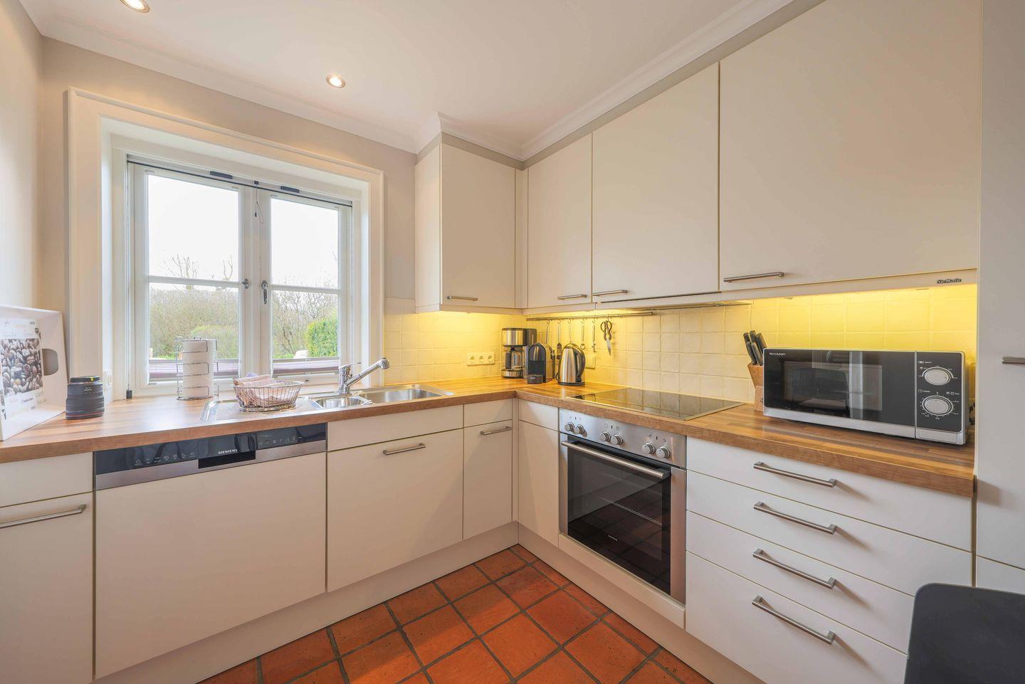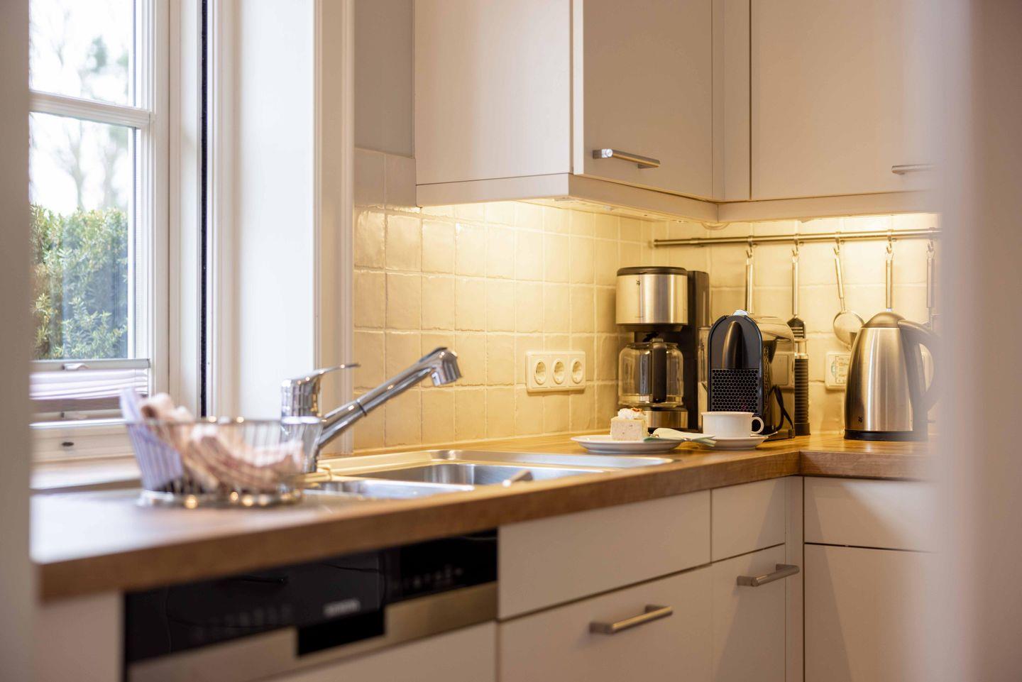 Die Küche lässt mit Geschirrspüler, Herd, Backofen, einem großen Kühlschrank und zahlreichen weiteren Annehmlichkeiten wie einer Mikrowelle und einem Mixer keine Wünsche offen. Geschirr und Geschirrhandtücher sind ebenso vorhanden wie die Wahl zwischen einer Kapsel- und einer Filterkaffeemaschine. Zum Frühstücken lädt eine kleine Essecke in der Küche ein. Helle Küchenfronten und Fliesen unterstreichen die Modernität des Raumes.