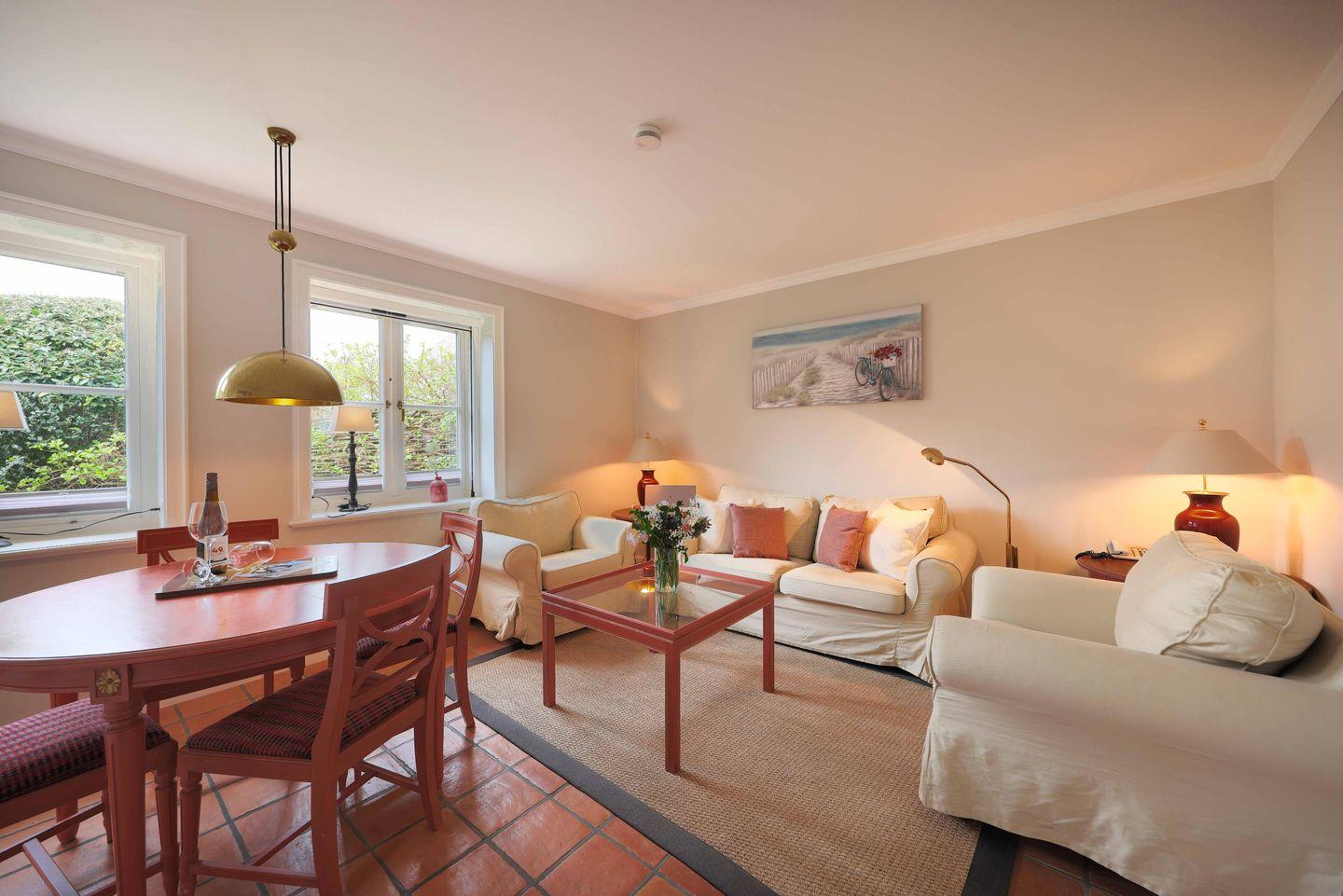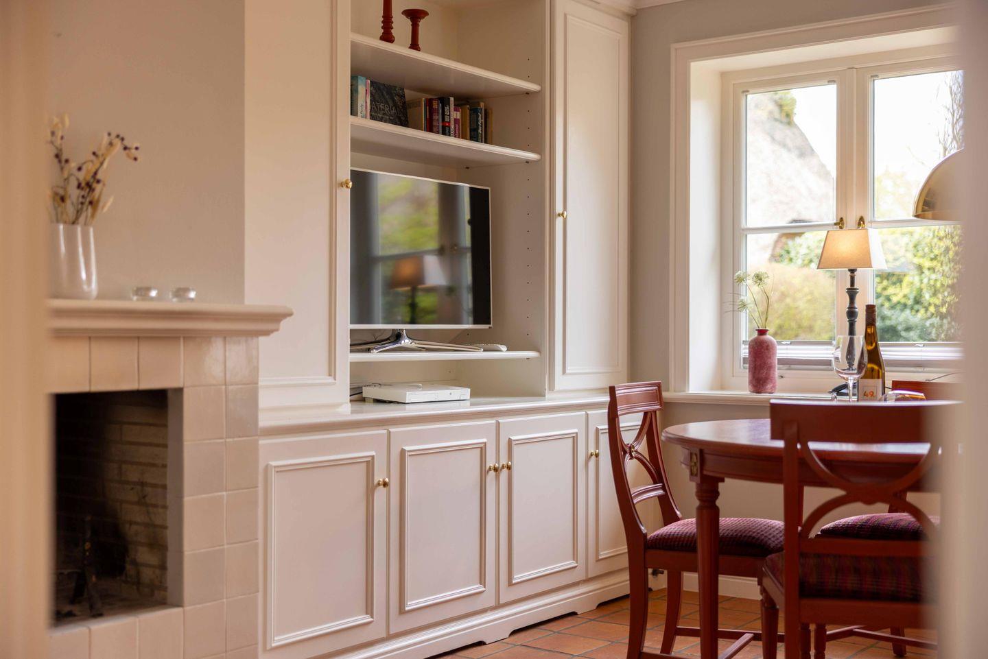 Im Wohnzimmer findet sich eine gemütliche Sitzgruppe, welche mit schönen Farbakzenten aufgelockert wird. Darüber hinaus finden sich im Wohnbereich auch eine Essecke und ein offener Kamin, welcher für besondere Behaglichkeit sorgt. Beheizt wird der Raum mit einer Fußbodenheizung. Ein SmartTV ist ebenso vorhanden wie ein Bluray-Player und eine Dockingstation für iPod, iPhone und iPad, so dass die Unterkunft über aktuellste Ausstattung verfügt. Die großen Fenster sind mit Insektenschutz-Rollos ausgestattet.