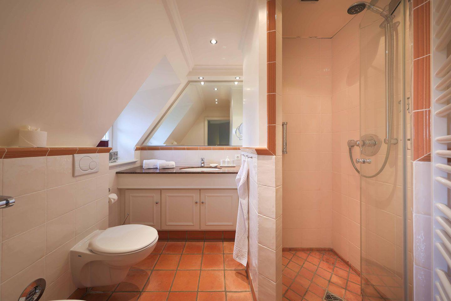 Auch im oberen Badezimmer kann mit vielen Ausstattungsdetails aufwarten. So gehören neben einer bodengleichen Dusche auch ein Bidet, Kosmetikspiegel und Föhn zu den vorhandenen Annehmlichkeiten. Auch hier sorgt eine Fußbodenheizung für Wärme und es sind Bademäntel und Handtücher vorhanden.