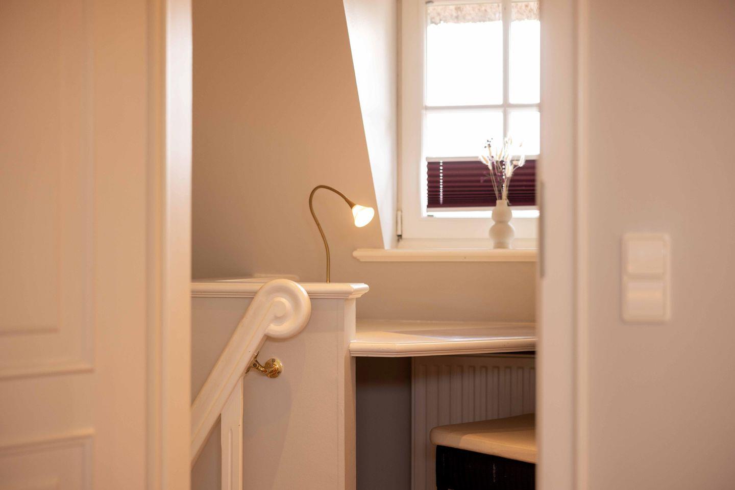 Auf der Empore des oberen Geschosses befindet sich ein kleiner Arbeitsbereich. Außerdem gehört ein Waschraum zur Unterkunft. Hier finden sich neben einem Waschtrockner auch Bügelbrett und -eisen sowie weitere Haushaltsgegenstände, welche genutzt werden können. Feuermelder sorgen für zusätzliche Sicherheit.