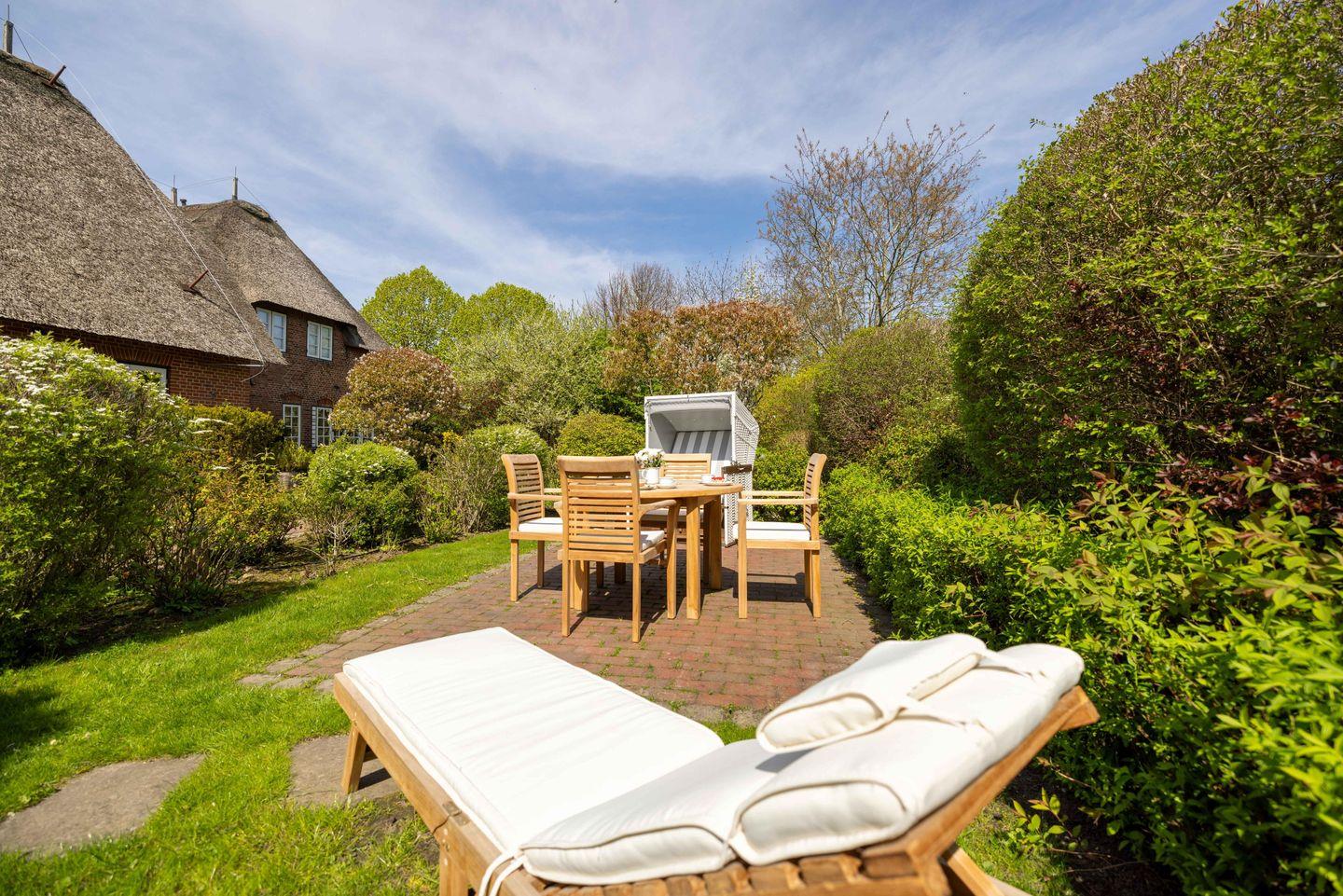 Der eigene Gartenanteil des Ferienhauses ist sonnig und geschützt angelegt, sodass Sie in Ihrem eigenen Strandkorb den Tag genießen können. Überdies bietet der Garten eine Sitzgruppe, welche auf der von Grün umgebenen Terrasse liegt. Ein Sonnenschirm sorgt für Schatten an warmen Tagen.