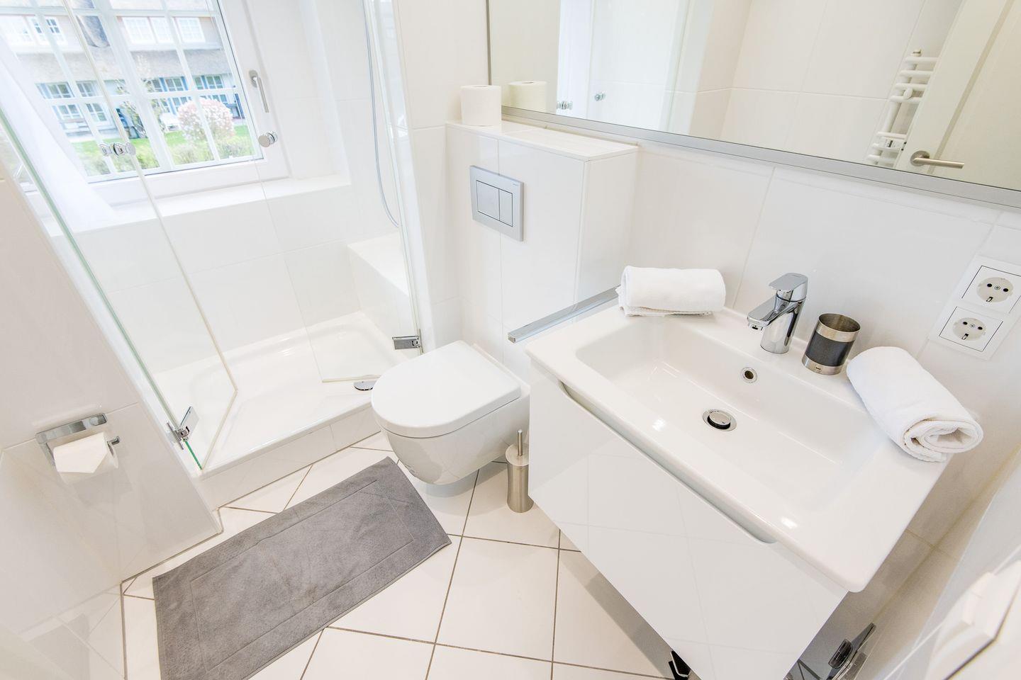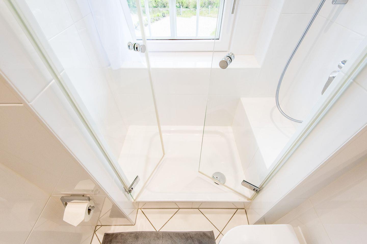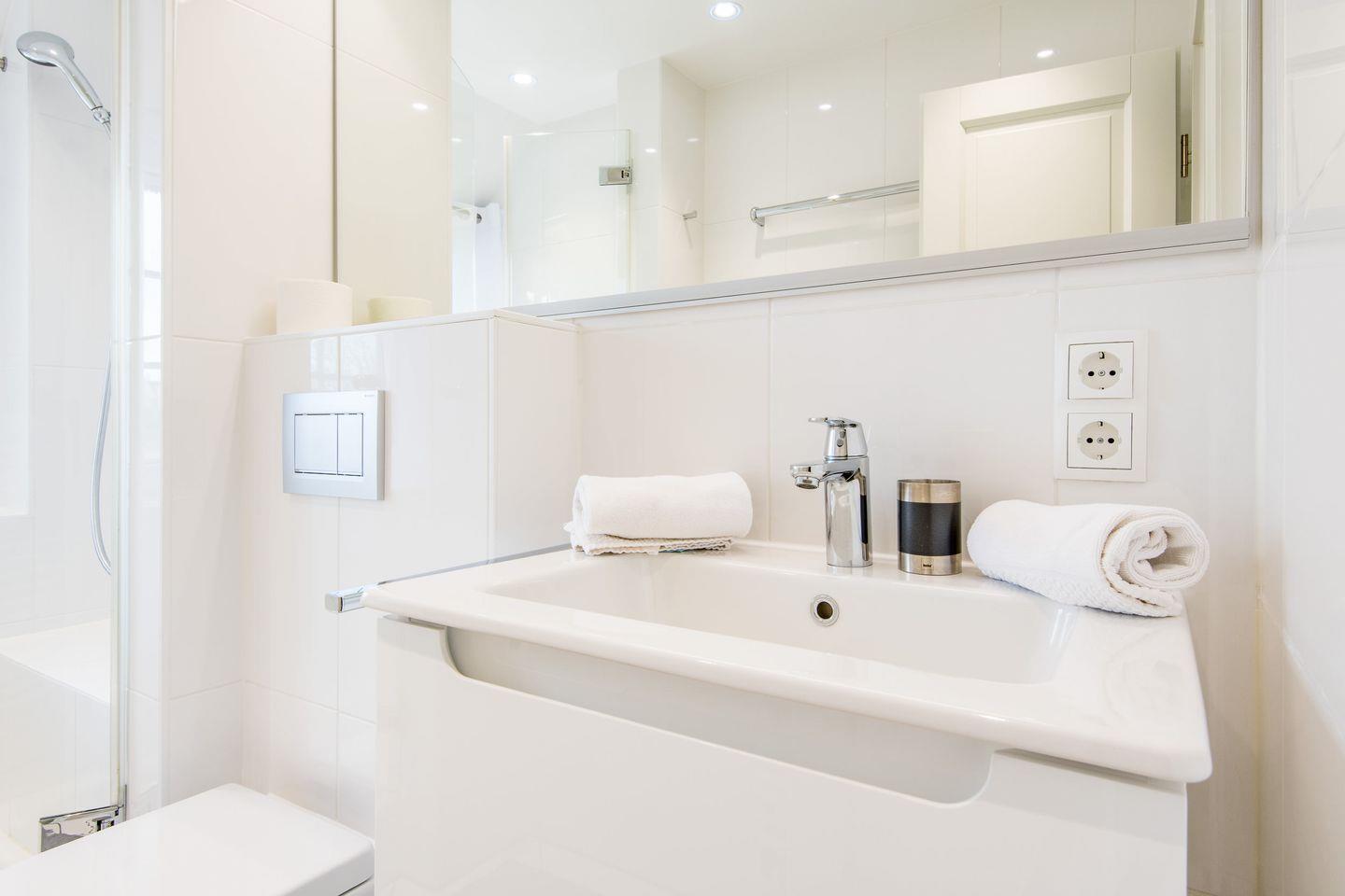 Das moderne Badezimmer ist mit einer ebenerdigen Dusche, WC und Handtuchwärmer ausgestattet, sodass Sie erfrischt in den Tag starten können.