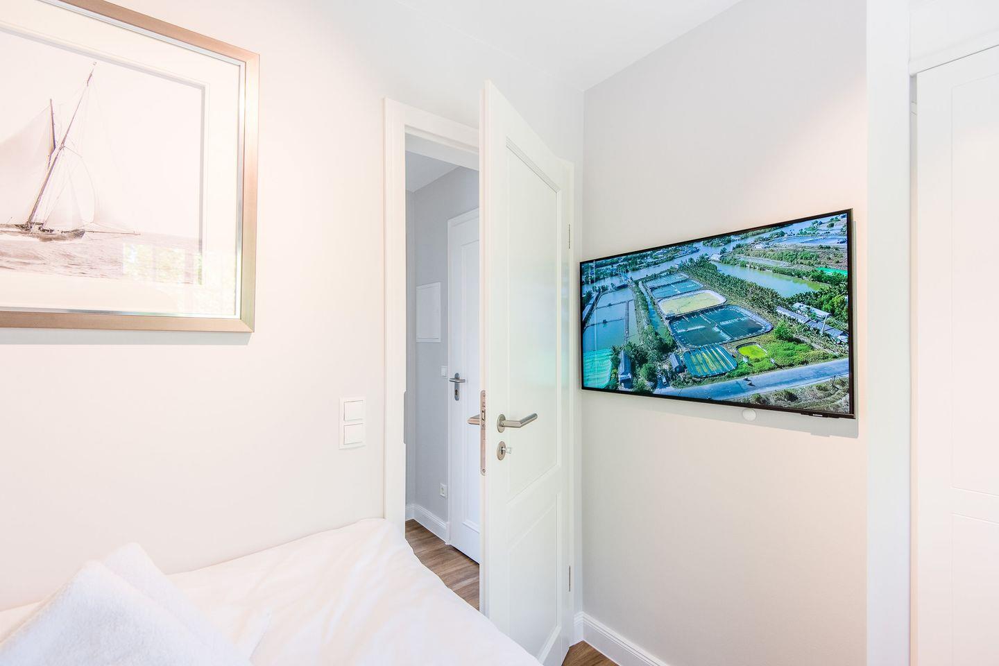 Das Hauptschlafzimmer bietet ein hochwertiges Boxspring-Doppelbett (180x200 cm), TV und Einbauschränke, die für zusätzlichen Stauraum sorgen. Eine Treppe führt vom Wohnzimmer in das Dachgeschoss, wo sich das zweite Schlafzimmer mit zwei Einzelbetten befindet – ideal für Kinder.