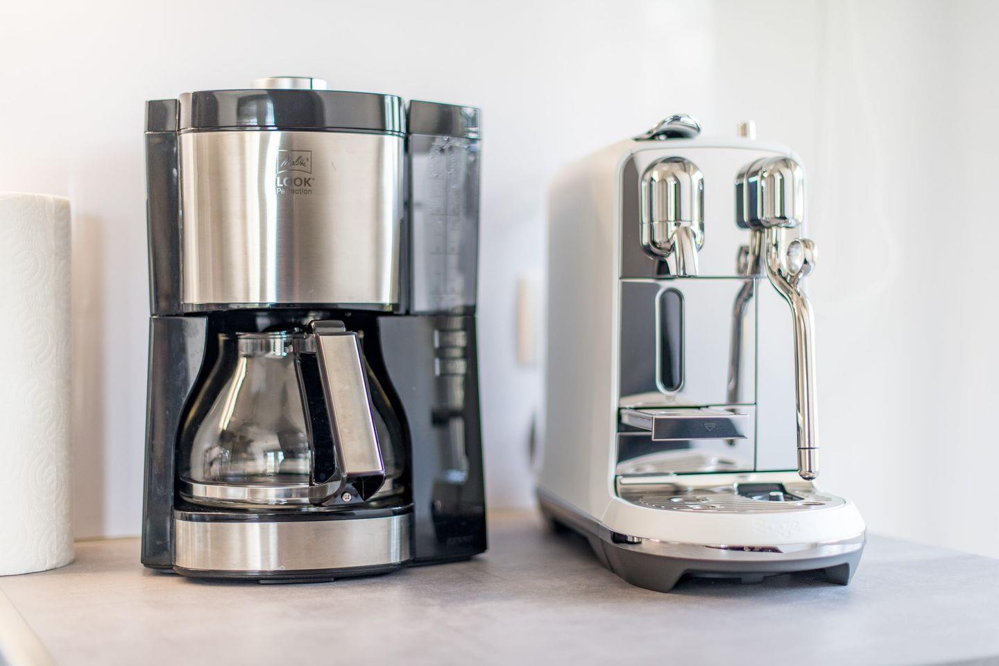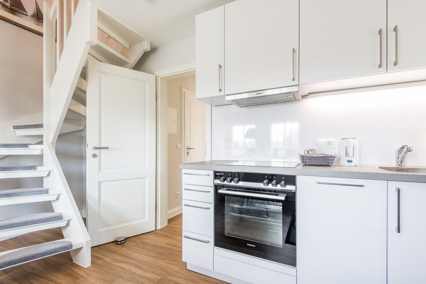 Das Wohnzimmer ist mit einem hochwertigen Schlafsofa und einem TV ausgestattet und bietet Raum zum Entspannen und Verweilen. Die angrenzende Wohnküche verfügt über einen Esstisch für 4 Personen und ist mit einem Cerankochfeld, Geschirrspüler und einer Espressomaschine bestens ausgestattet – alles, was Sie für Ihren Aufenthalt benötigen.