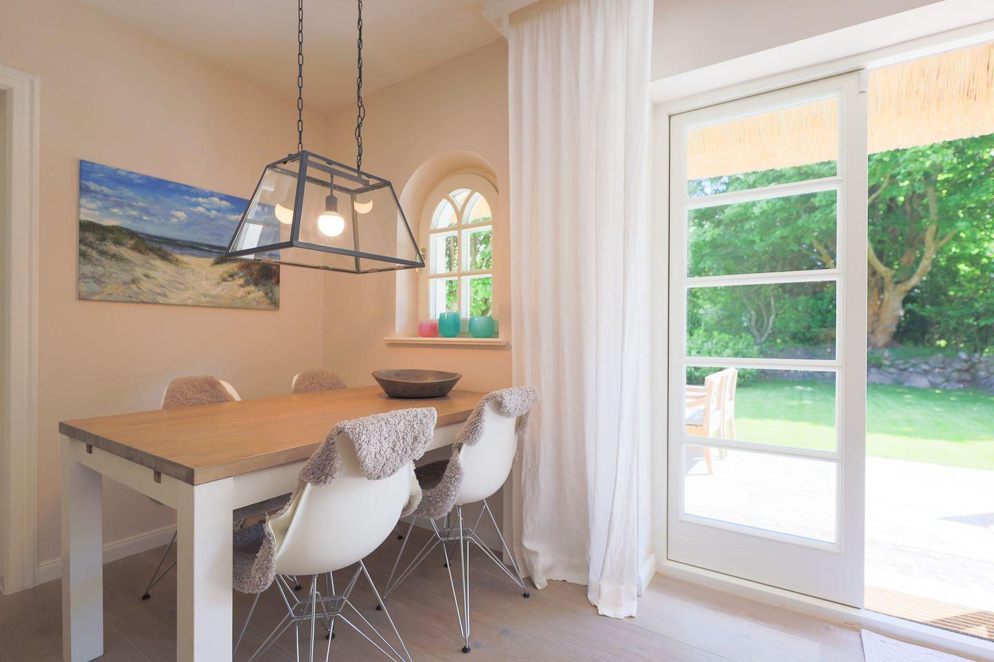 Dieses ganz besondere Haus vereint Offenheit und Privatsphäre ebenso wie stylisches Design und traditionelle Elemente. On top noch ein großer Garten mit Terrasse und Sauna. Was will man mehr? Der lichtdurchflutete Wohnraum ist offen gestaltet und wirkt weitläufig und luftig..Die Farbpalette bewegt sich, wie im gesamten Haus, im neutralen, natürlichen Bereich. Moderne Designermöbel bilden einen spannenden Kontrast zu den klassischen Elementen des Hauses wie dem original Schwedenofen und den Sprossenfenstern mit der breiten Fensterbank, die mit Kissen ausgestattet zum gemütlichen Sitzplatz mit Blick in den Garten wird.