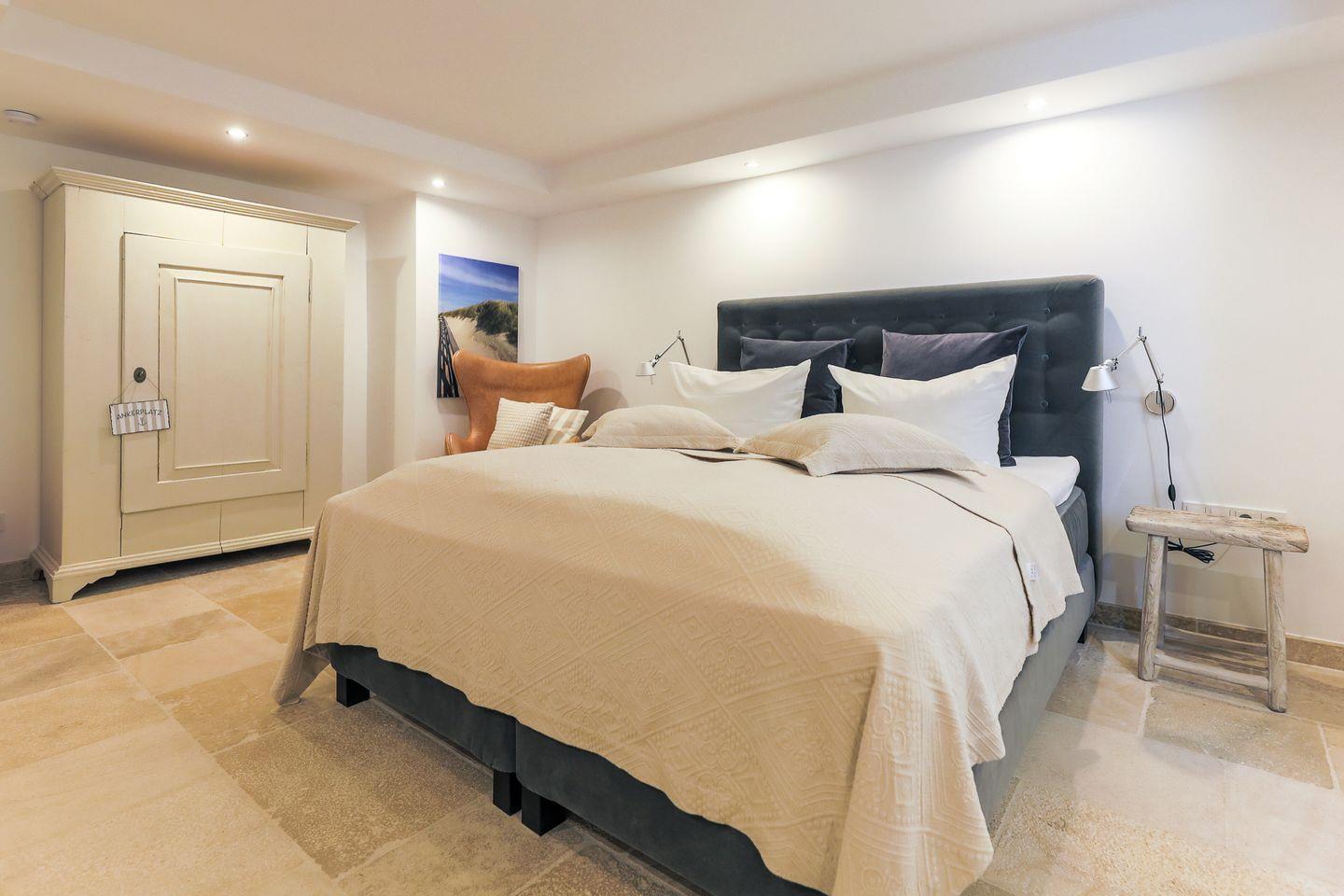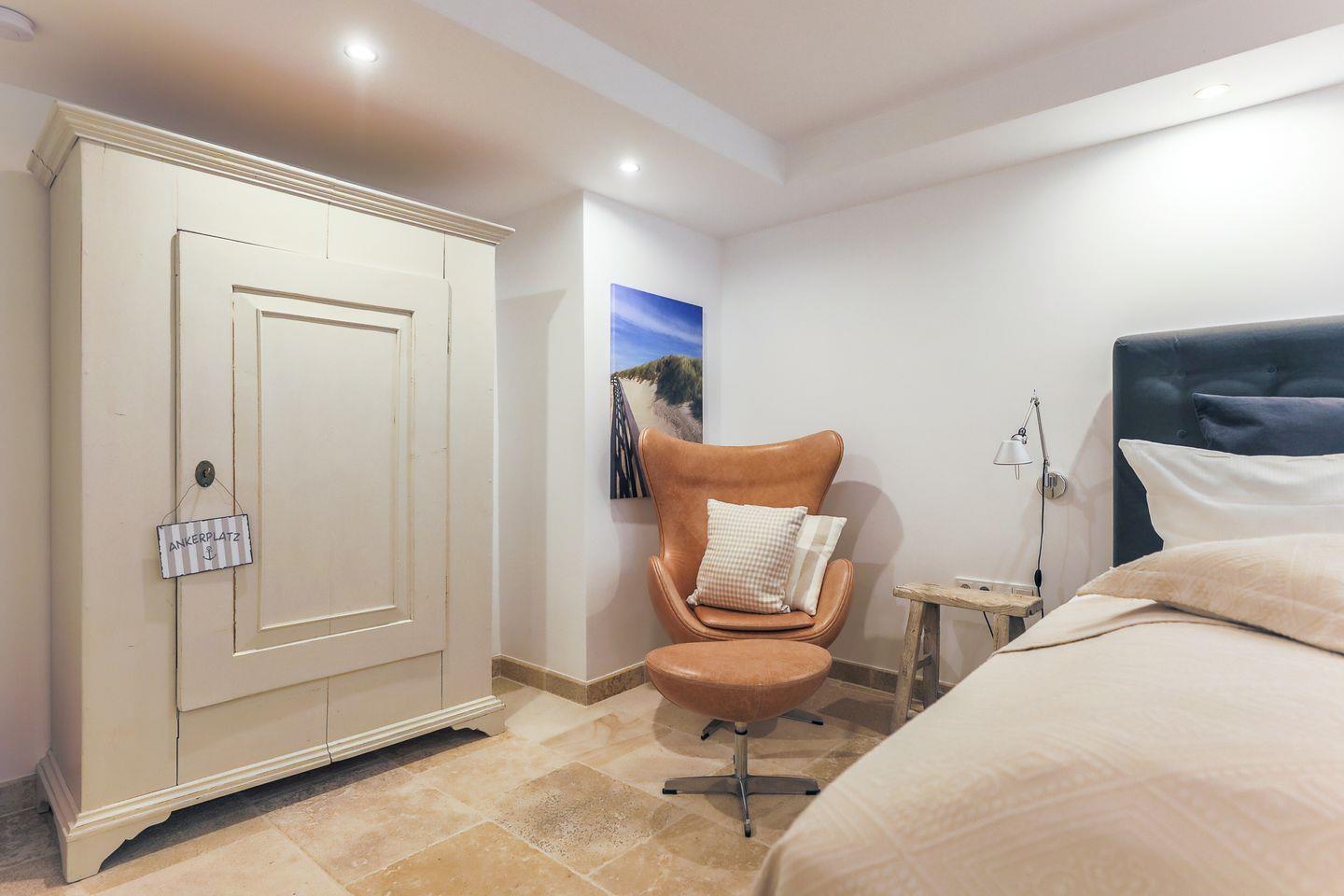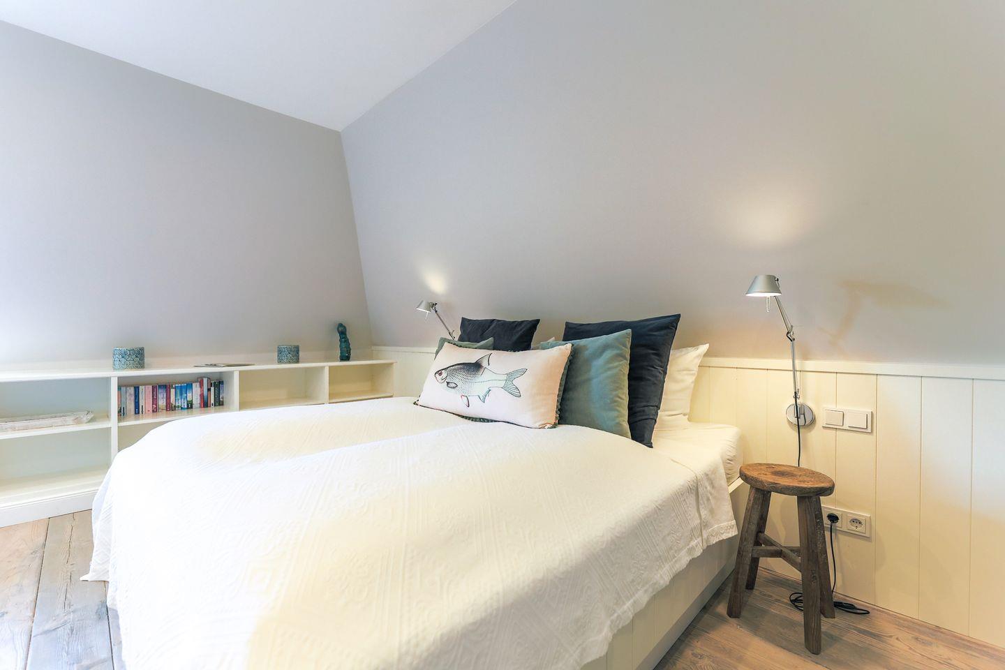 Zurück im Haus greifen die insgesamt drei Schlafzimmer (zwei im Obergeschoss, eins im Souterrain) das Interior-Konzept wieder nahtlos auf: Ganz viel Weiß, komfortable Betten und raffinierte Details schaffen hier eine entspannte Atmosphäre.