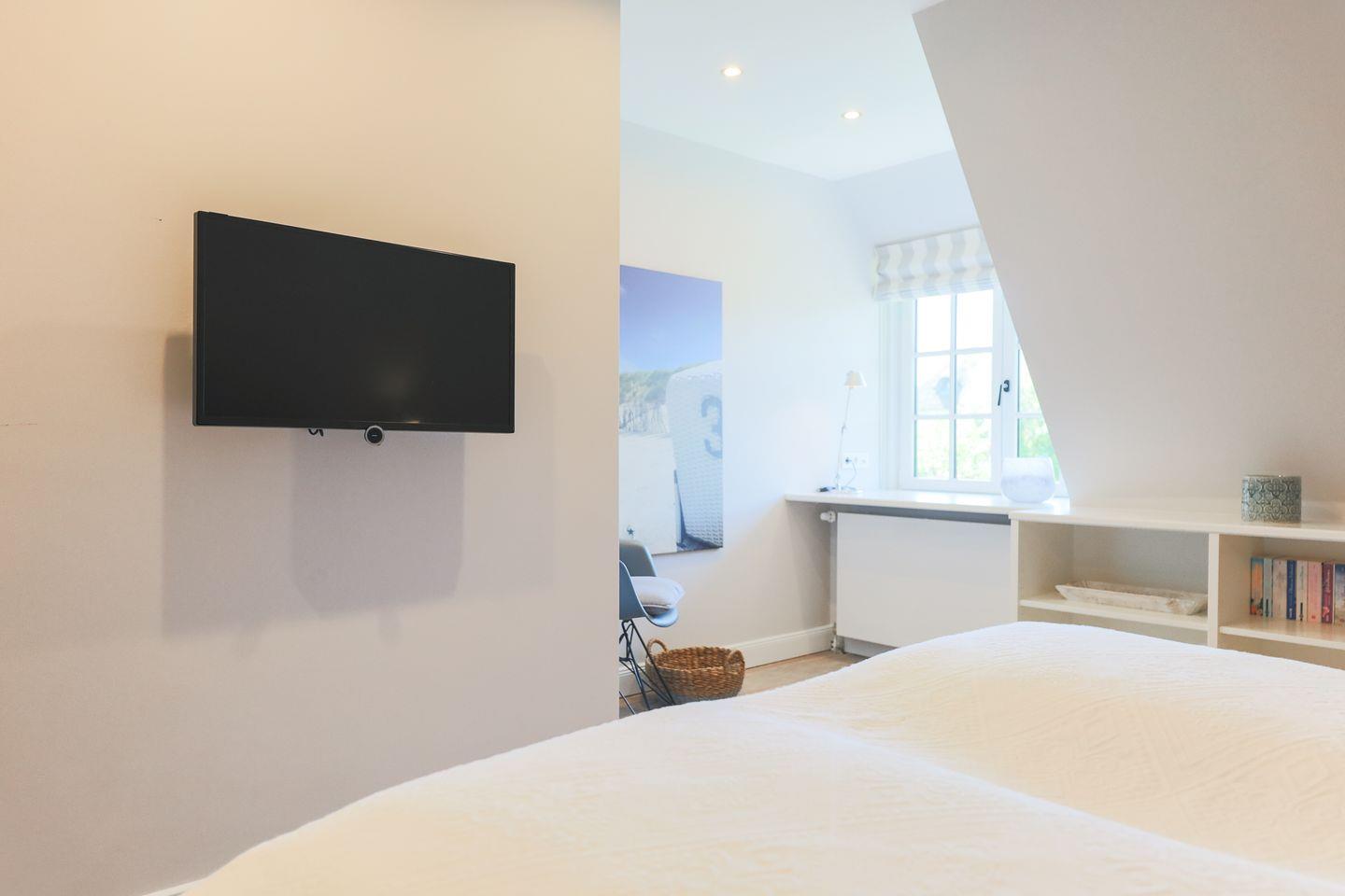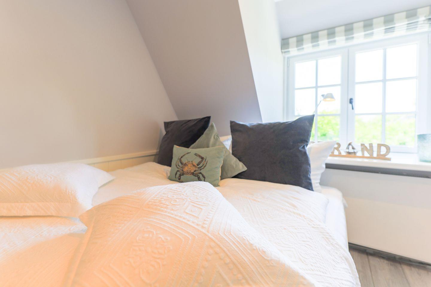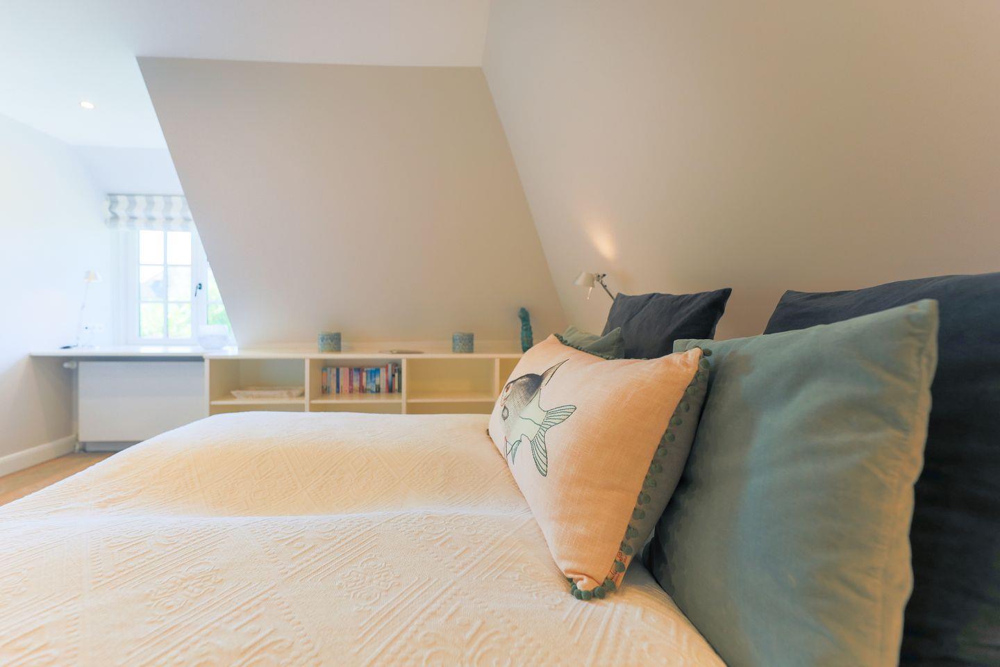 Zurück im Haus greifen die insgesamt drei Schlafzimmer (zwei im Obergeschoss, eins im Souterrain) das Interior-Konzept wieder nahtlos auf: Ganz viel Weiß, komfortable Betten und raffinierte Details schaffen hier eine entspannte Atmosphäre.