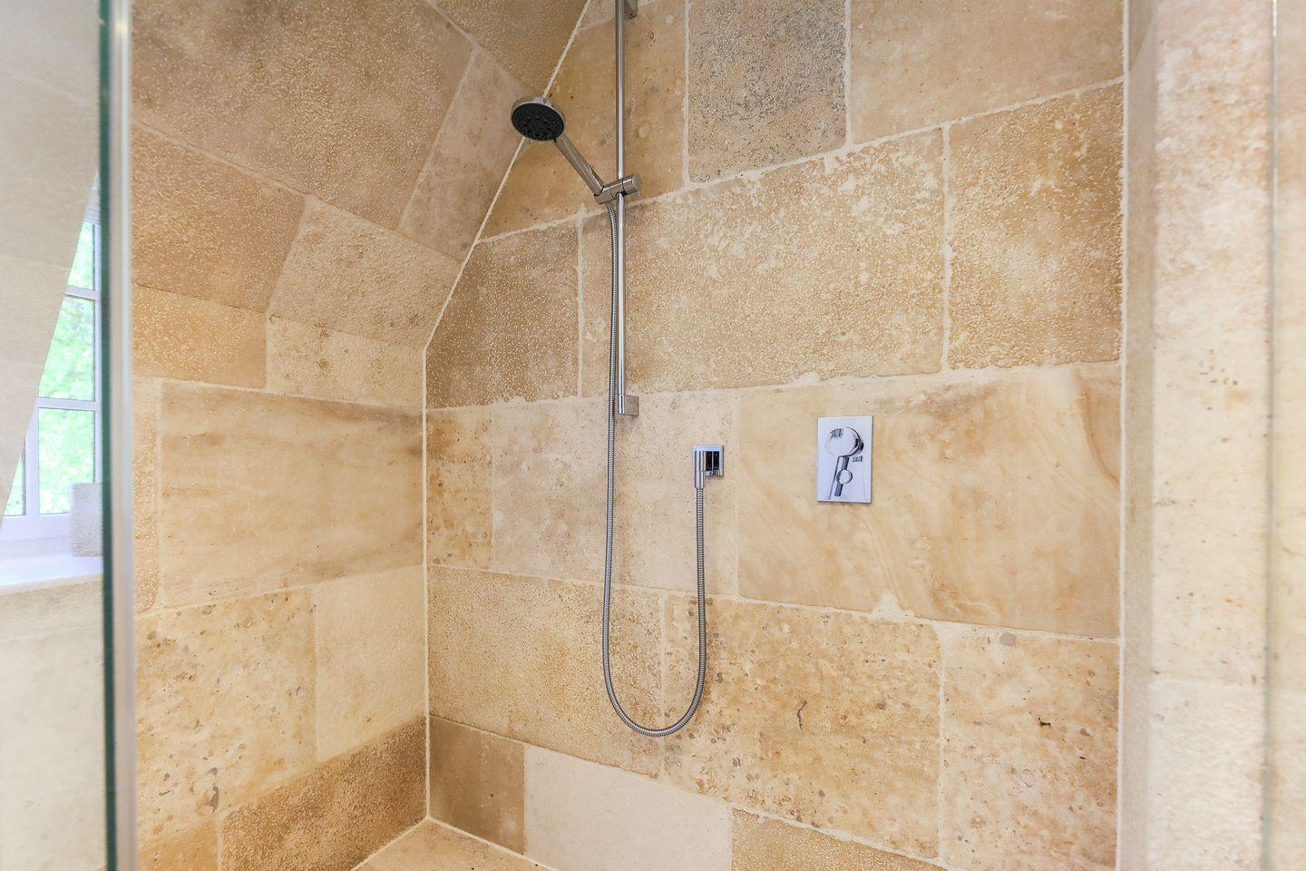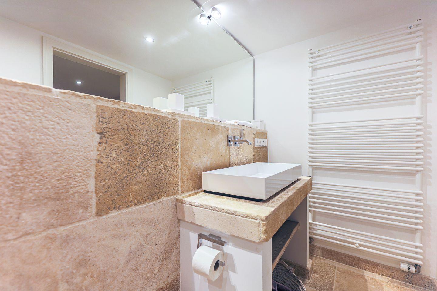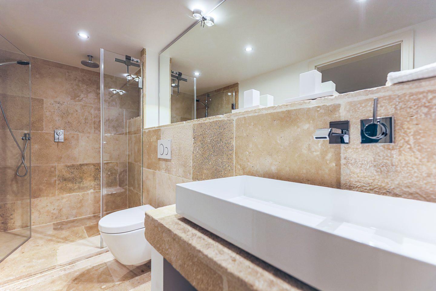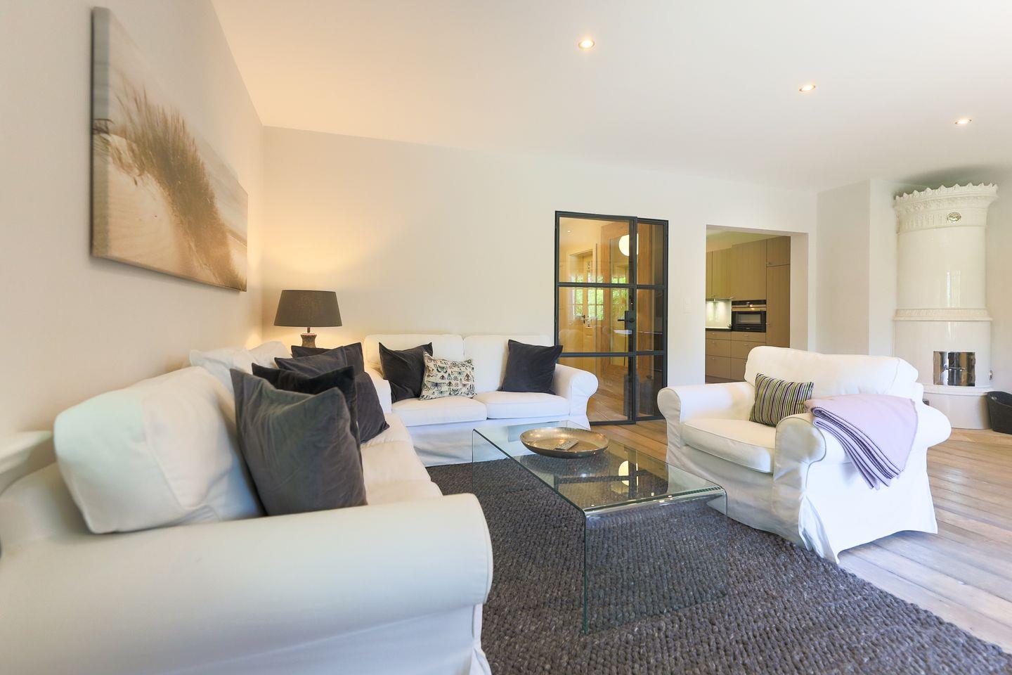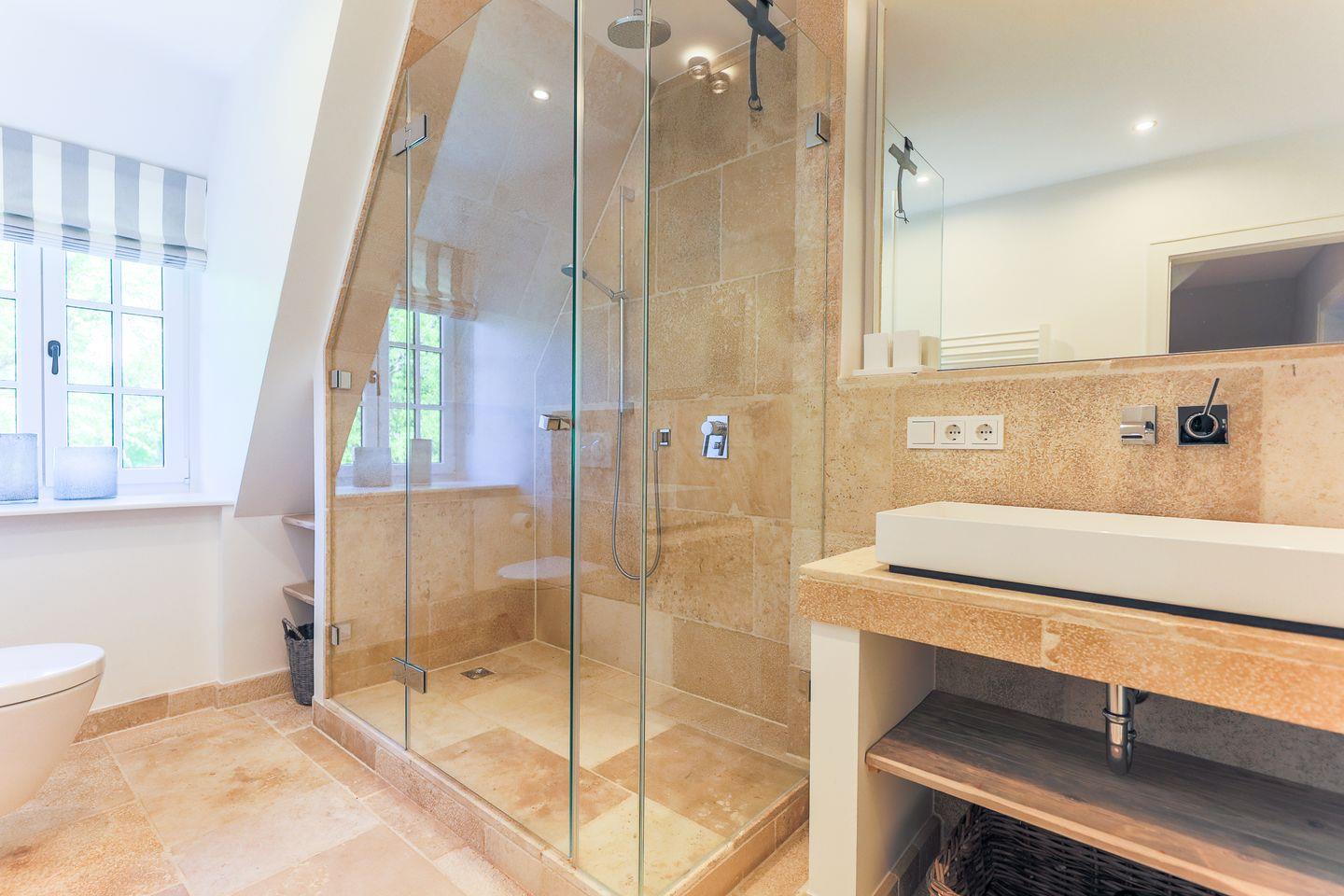 Ebenfalls dreimal vorhanden: die Badezimmer (eins im Obergeschoss, eins im Souterrain sowie ein Gäste-WC), die wie ein modernes Spa gestaltet wurden, das zum Entspannen und Verweilen einlädt. Mit beigem Naturstein und weißer Geradlinigkeit strahlt es auf eine und reduzierte Weise Eleganz aus - die Ausstattung mit Regenshower-Dusche verspricht Luxus pur. Ein weiteres Highlight im Souterrain ist die große Sauna mit Ruheraum inklusive Liegen. Ein absolutes Must für Wellness-Fans, dass das Sommerhaus auch in der kälteren Jahreszeit zu einem Wohlfühlort macht!