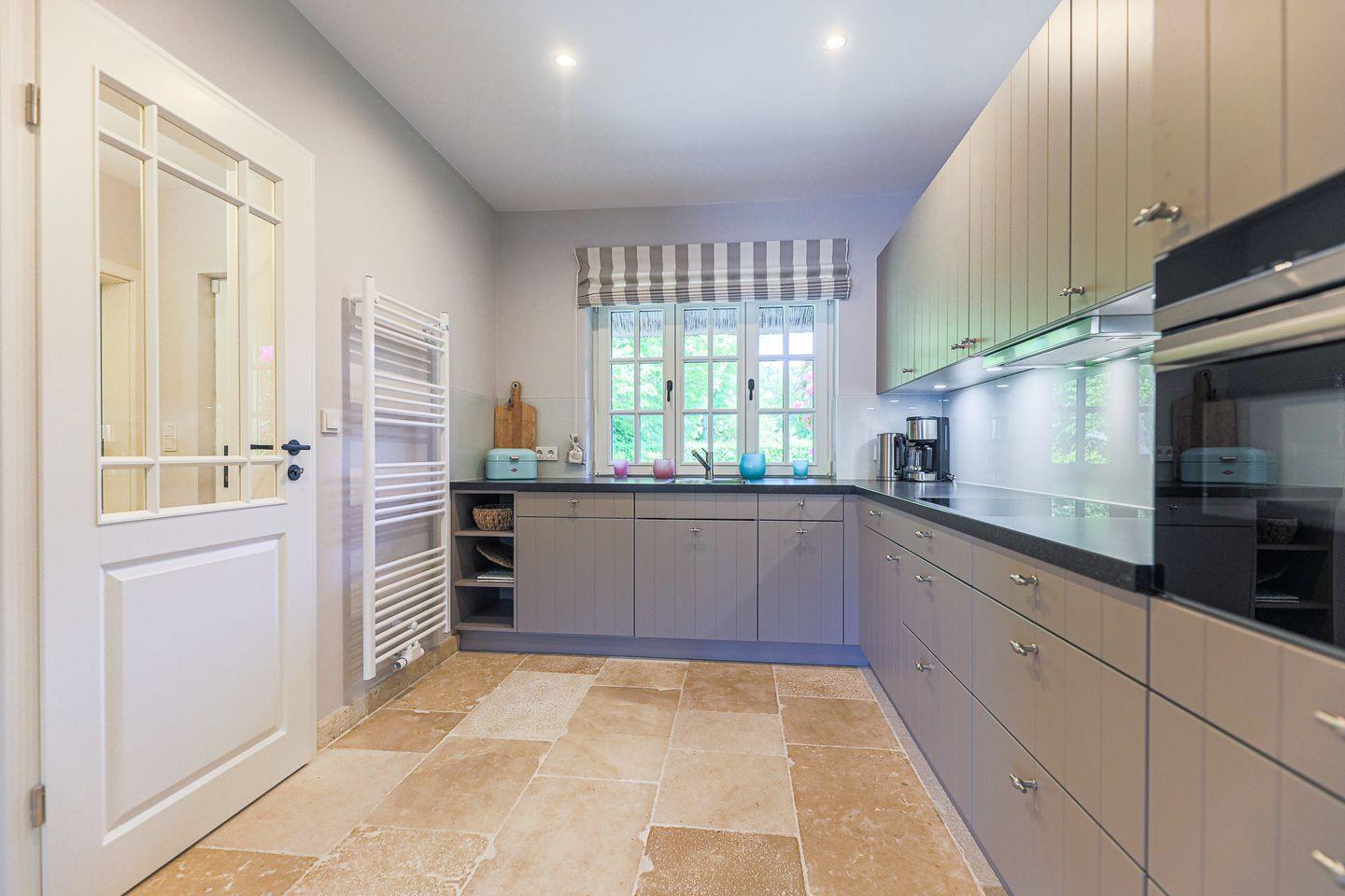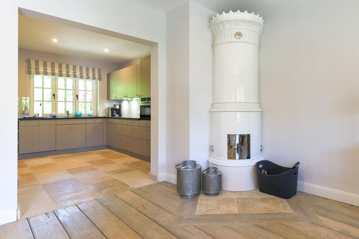 Auch die Küche schafft mühelos den Spagat zwischen Trend und Tradition mit einer sehr reduzierten Einrichtung und einer hochmodernen Ausstattung (Hochbaubackofen mit Mikrowelle, Nespressomaschine). Allerdings wurde dabei nicht auf durchgestylte, grifflose Hochglanzfronten, sondern auf sehr subtile Weise das Country-Thema mit natürlichen Materialien und klassischeren Details beibehalten.