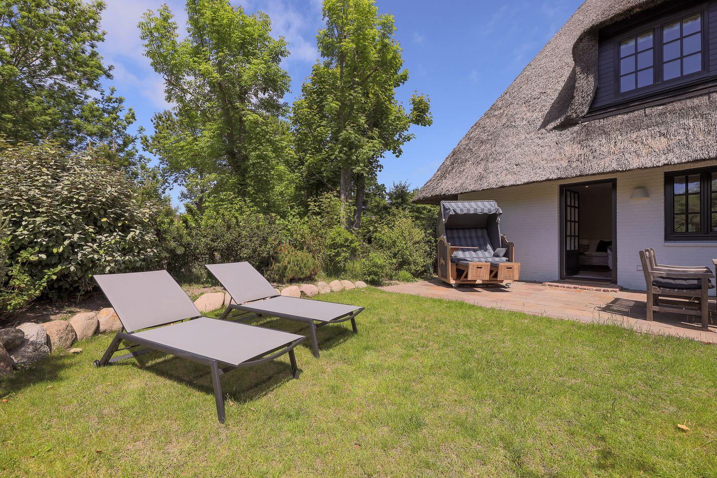 Ordentlich Farbe bringt hingegen der große grüne Süd-West-Garten ins Spiel, der mit seinen Liegen und dem Strandkorb zum Relaxen einlädt.