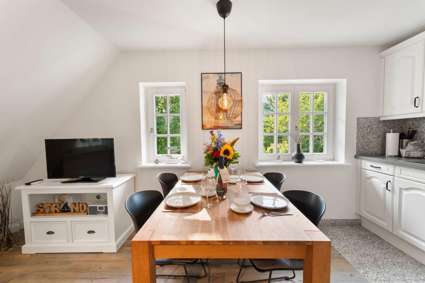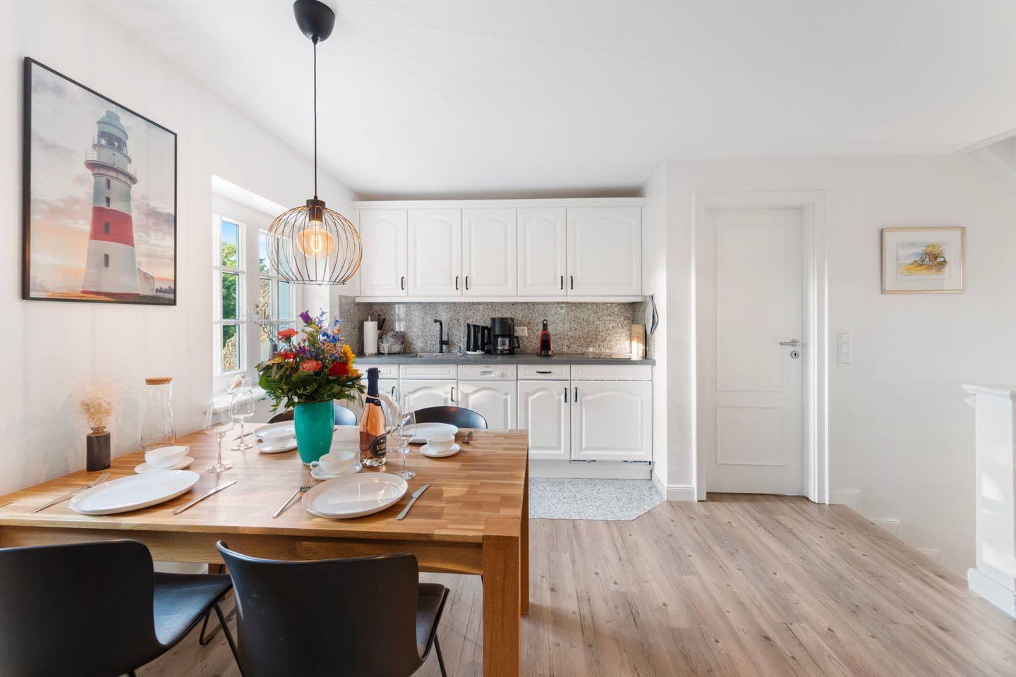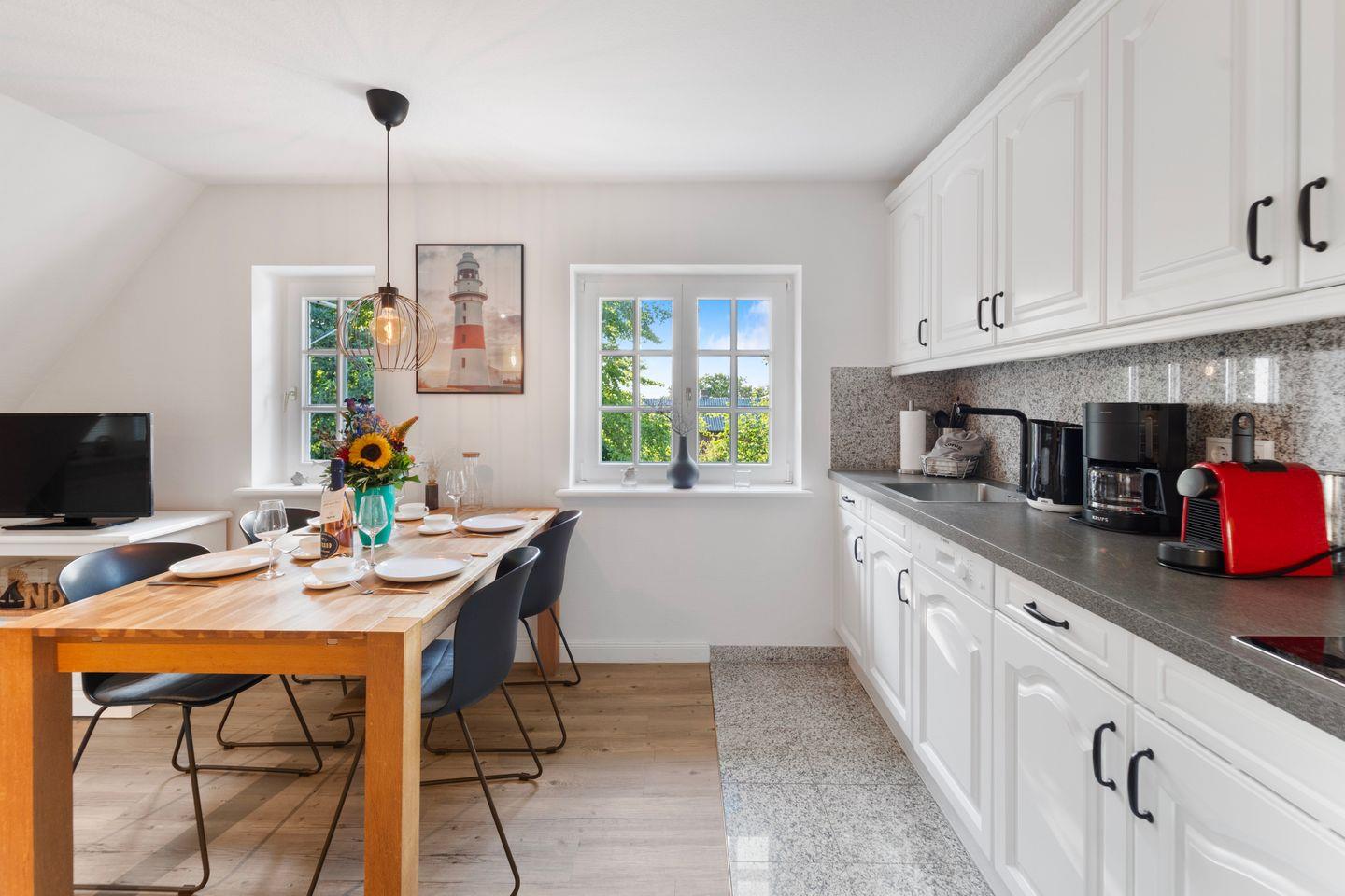 Die Küche ist modern ausgestattet und lässt keine Wünsche offen – ideal für die Zubereitung von leckeren Mahlzeiten. Am angrenzenden Esstisch können Sie gemeinsam speisen und gemütliche Abende verbringen.