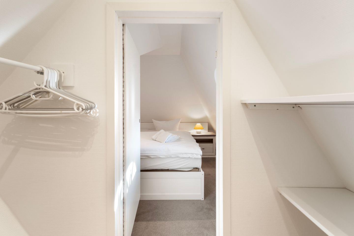 Auf der ersten Ebene befindet sich ein Schlafzimmer mit zwei Einzelbetten (90x200 cm) und einer großzügigen Raumhöhe. Über eine Treppe erreichen Sie das zweite Schlafzimmer im Dachgeschoss, das mit einem Doppelbett (2x 90x200 cm) ausgestattet ist. Hier befindet sich eine großzügige Abseite, die als Stauraum für Kleidung und Koffer dient.