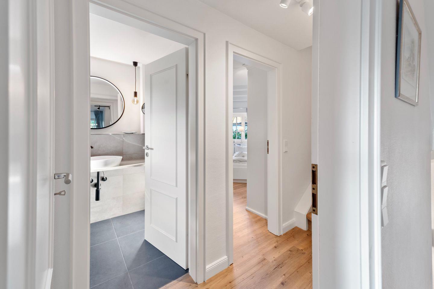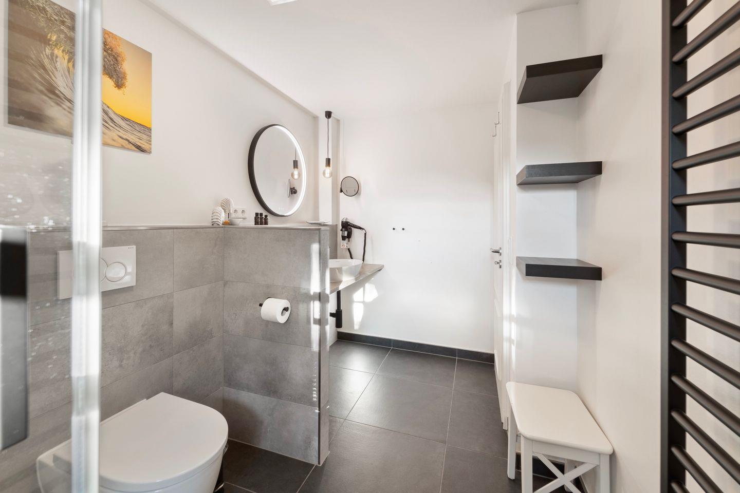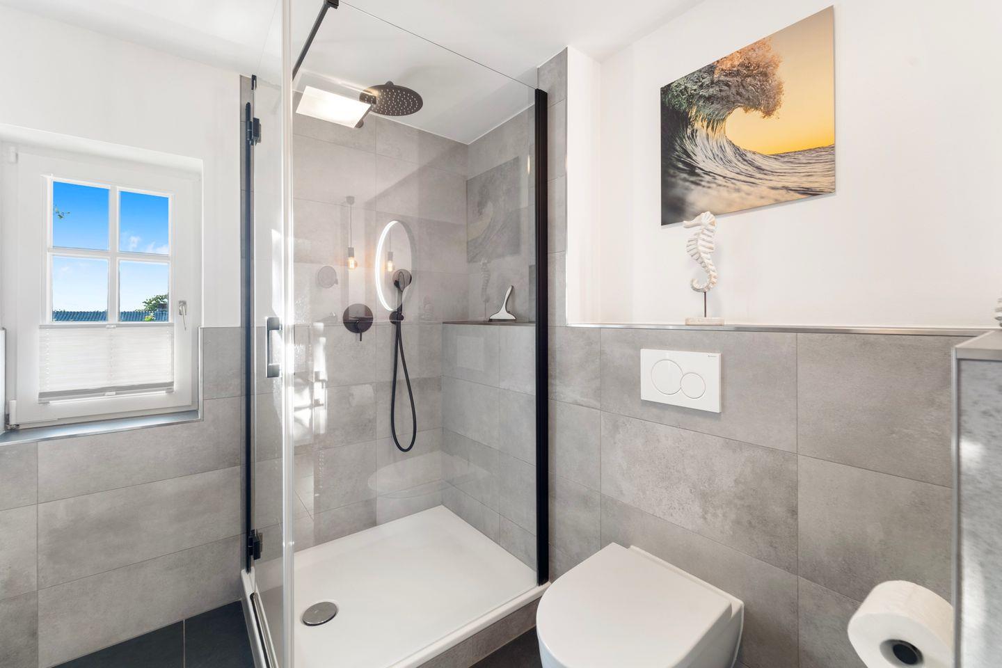 Das moderne Badezimmer mit bodengleicher Dusche und WC befindet sich auf der ersten Ebene und ist ein komfortabler Rückzugsort.