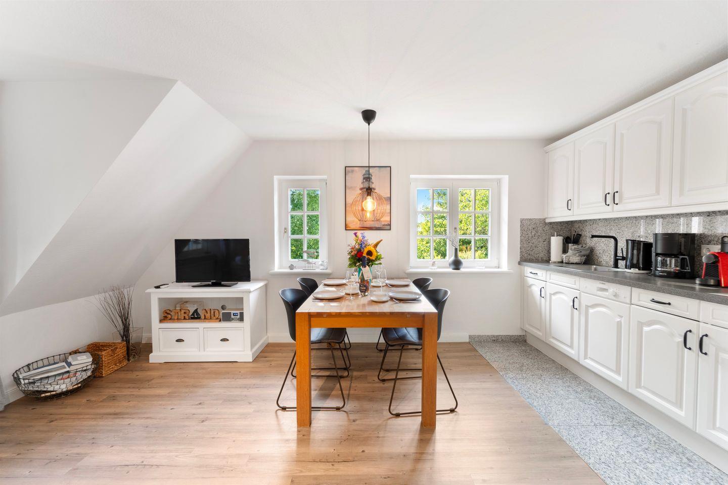 Das einladende Wohnzimmer ist mit einer gemütlichen Sofaecke und einem offenen Küchen-Essbereich ausgestattet, perfekt für entspannende Stunden. Die großen Fenster bieten einen herrlichen Blick, um die Sylter Landschaft oder den Sonnenuntergang zu genießen. Für Familien mit kleinen Kindern ist ein Kinderhochstuhl vorhanden.