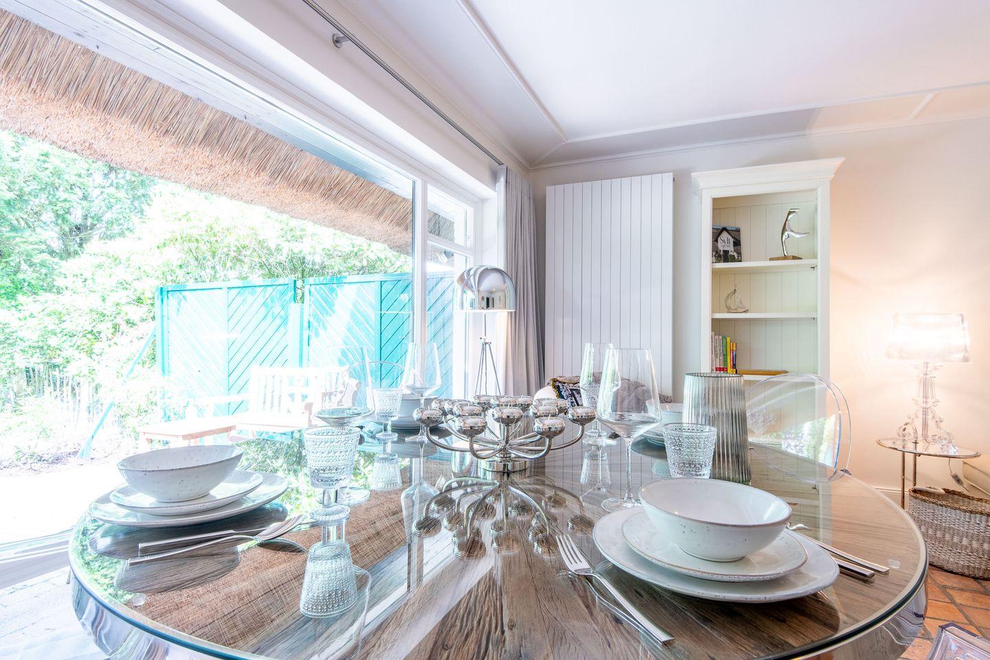 Das großzügige Wohn- und Esszimmer mit bequemer Sitzgarnitur lädt zum Entspannen ein. Hier können Sie nach einem erlebnisreichen Inseltag gemeinsam mit Familie oder Freunden entspannen. Die Südterrasse und der eigene Gartenbereich mit Sitzgelegenheiten bieten den perfekten Rahmen für Frühstück im Freien oder gesellige Abende in der Natur.
