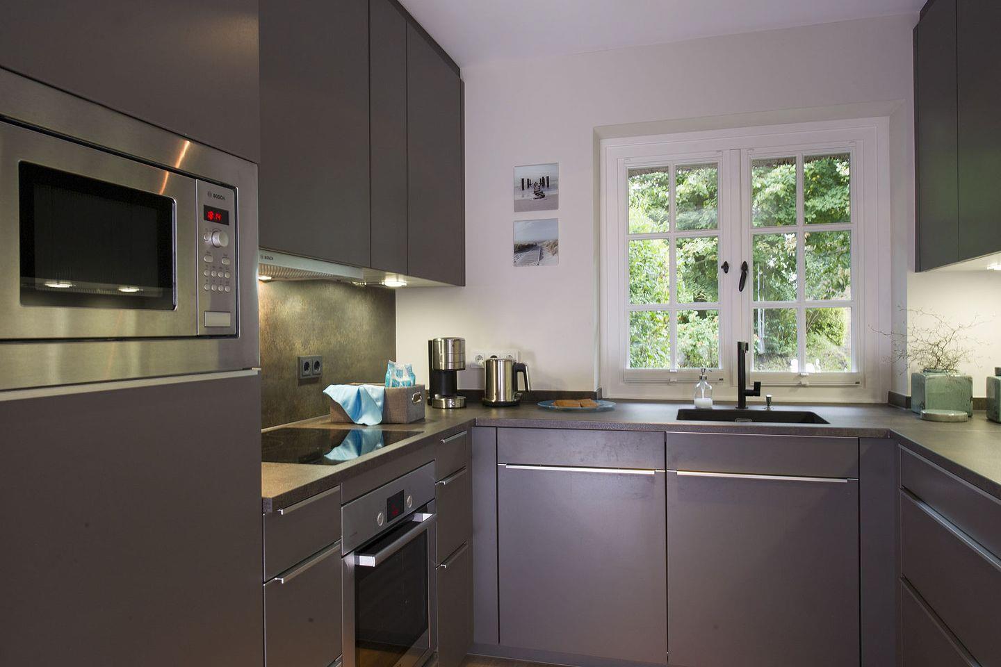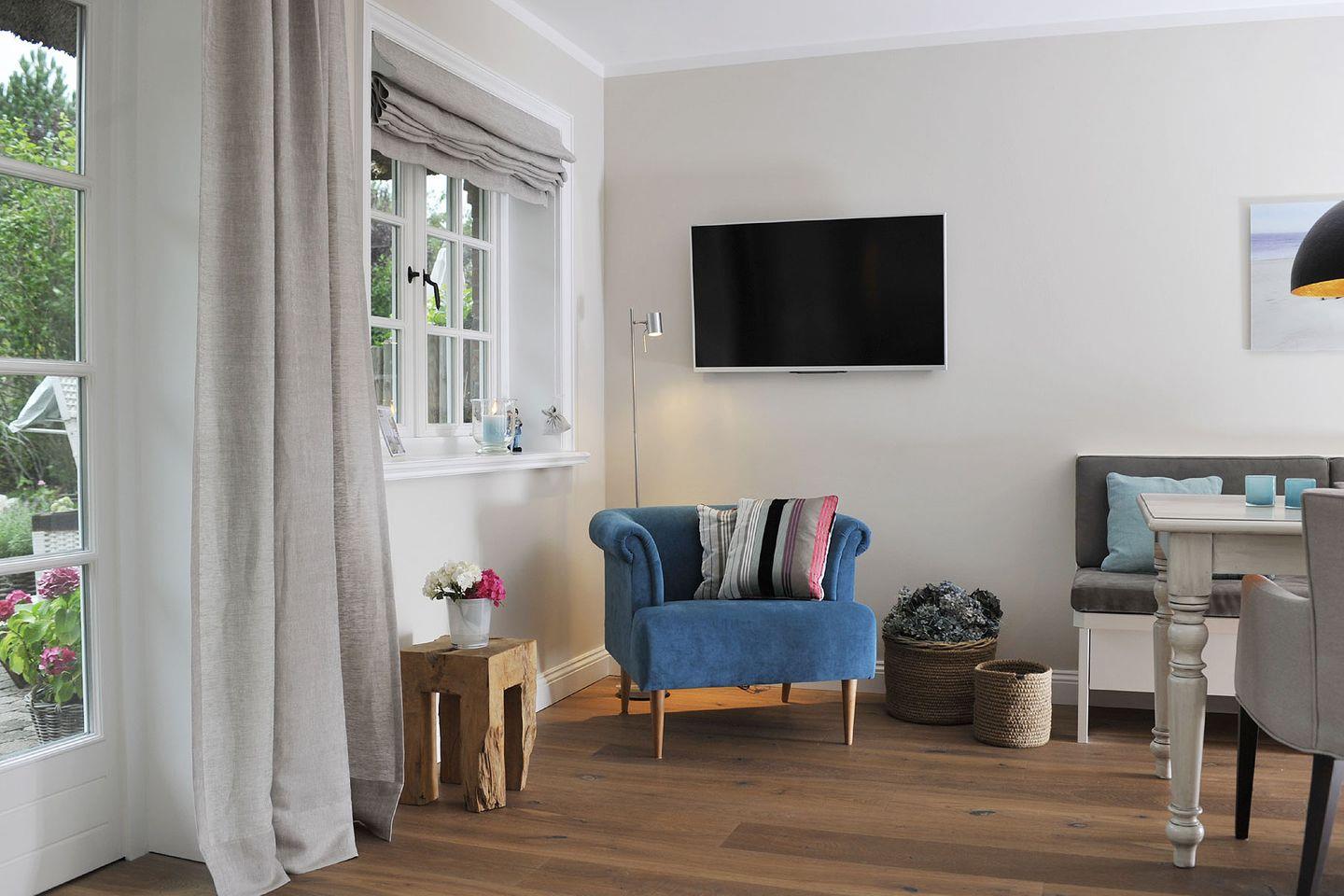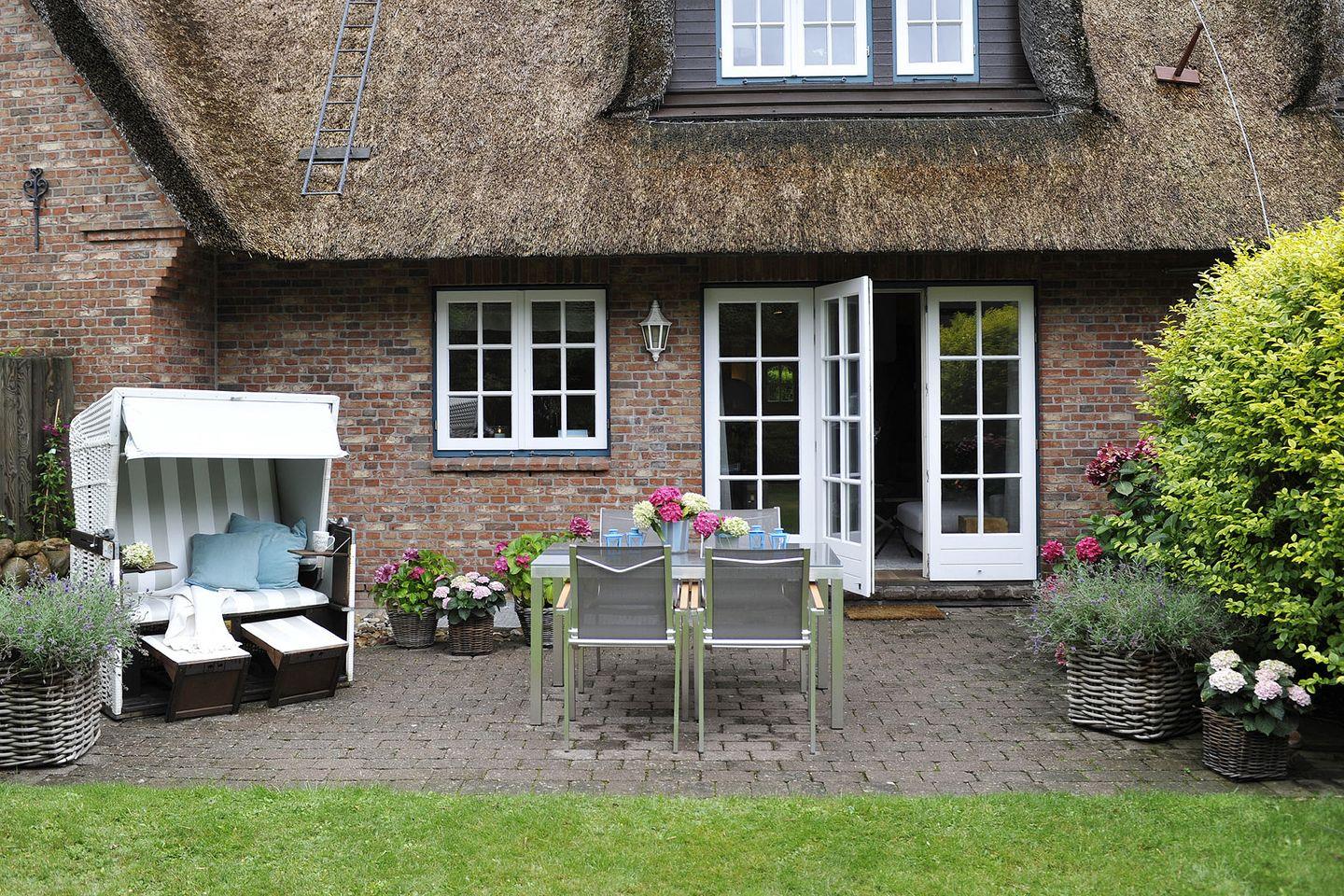 Das im Sommer 2014 neu konzipierte und vollständig renovierte Ferien Domizil an der Bahnhofstraße 22B ist ein Kleinod für alle Wellness-Fans. Maximal sechs Personen finden hier auf vier Ebenen und 136 m² ausreichend Platz. Der 180 m² große Garten und die nach Westen ausgerichtete Terrasse bieten zusätzlichen Raum zur Entspannung. Der moderne Hausteil unter Reet erwartet seine Gäste mit vielen schönen und einladenden Plätzen. Im Wohnzimmer sorgt ein Gaskamin für wohlige Wärme und zaubert einen Lieblingsplatz auf dem gemütlichen Sofa. Herzstück der Wohnung ist der große Esstisch, denn er verbindet die offene und umfangreich ausgestattete Küche mit dem Wohnbereich auf sehr sympathische Art und Weise. Die Inneneinrichtung basiert auf schönen und dezenten Farben, behaglichen Stoffen und ausgesuchten Requisiten. Ein privater, großzügiger Wellnessbereich im Souterrain des Hauses verführt zur Entspannung mit Sauna, Ruheraum und schönem Bad, er bietet Komfort und Wohlfühlgenuss auf höchstem Niveau.